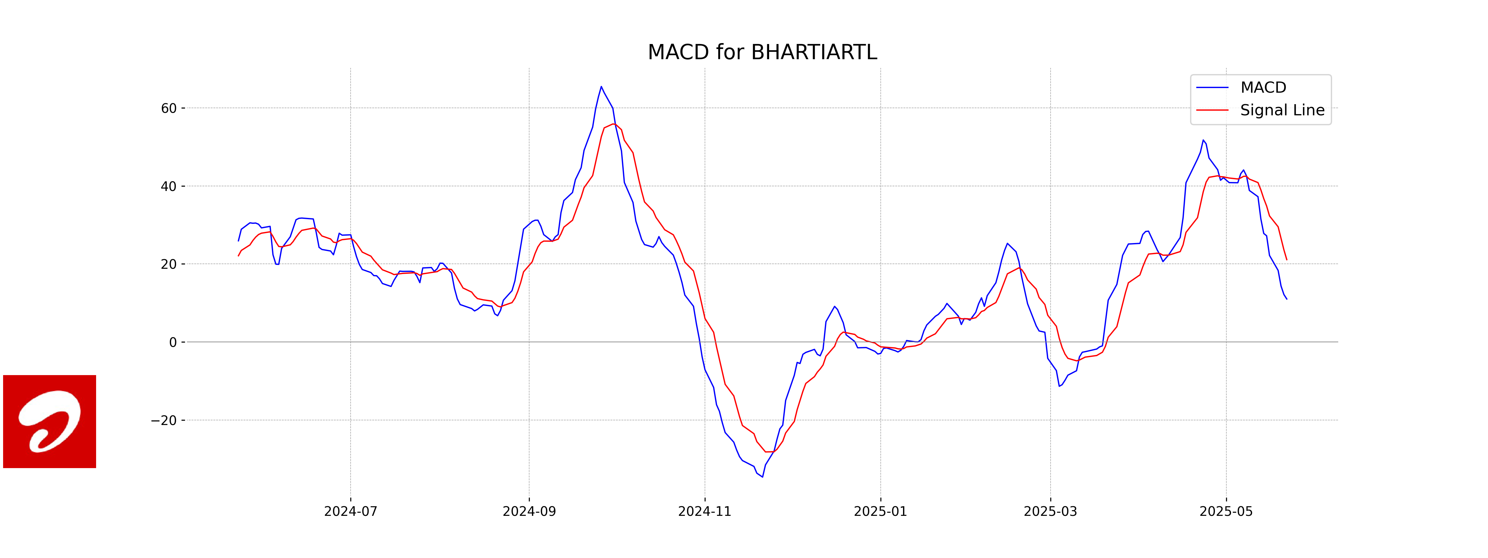 The MACD for Bharti Airtel is 11.01, while the MACD Signal is 21.09. This indicates a bearish crossover signal, as the MACD line is below the signal line. This situation can suggest potential weakness in the stock's recent uptrend.