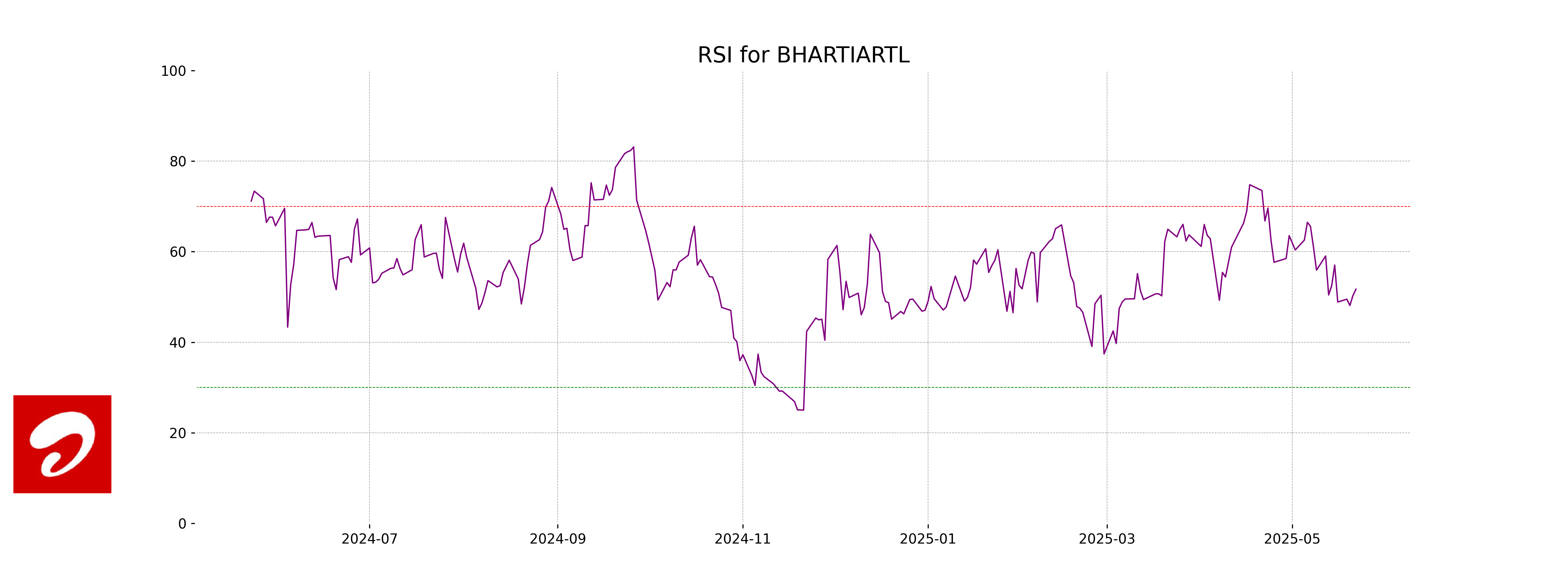 Based on the data provided, Bharti Airtel has a Relative Strength Index (RSI) of 51.72. This indicates a neutral market condition, suggesting that the stock is neither overbought nor oversold at the current level. An RSI between 30 and 70 typically signifies a stable momentum.