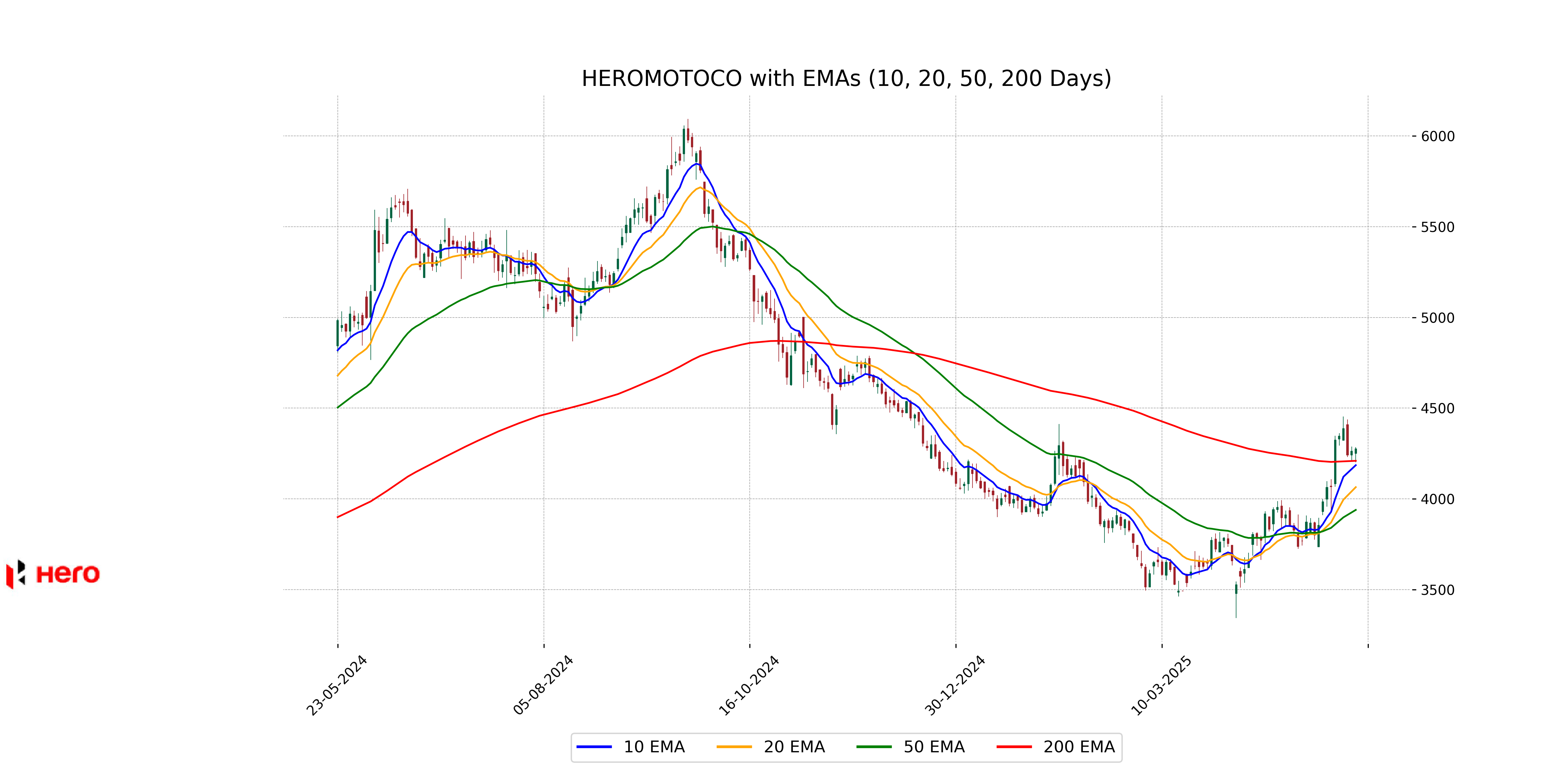 Based on the given data, Hero MotoCorp's current close price of 4276.30 is above its 50 EMA of 3939.28, 200 EMA of 4209.82, and 10 EMA of 4185.73, indicating a bullish trend. The stock is also trading higher than its 20 EMA of 4064.69, further supporting positive momentum.