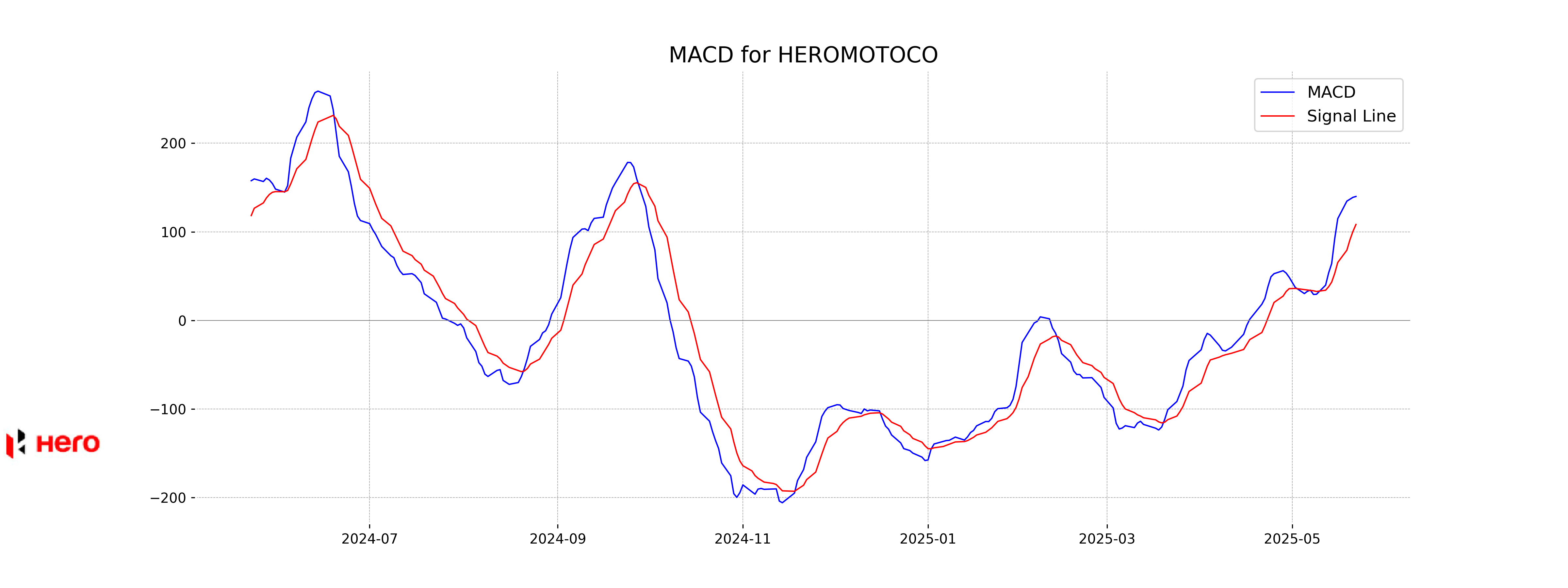 MACD Analysis for Hero MotoCorp: The MACD value for Hero MotoCorp is 139.86, which is above its signal line at 108.27. This indicates a bullish trend, suggesting positive momentum and potential further upward movement in the stock's price.