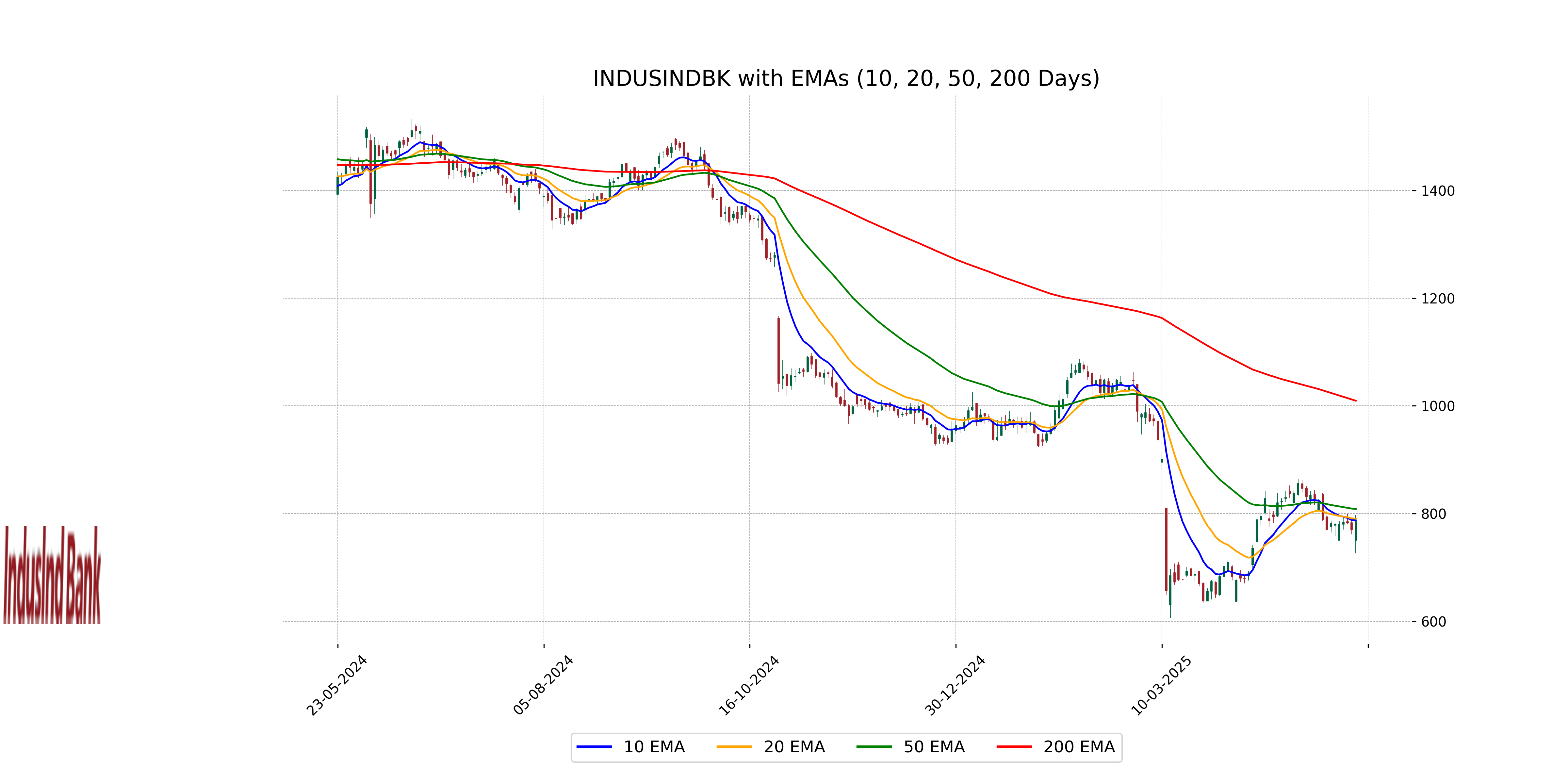 IndusInd Bank closed at 785.0, which is below its 50 EMA of 808.26 and significantly below its 200 EMA of 1009.57, indicating a bearish trend over the medium to long term. However, it is slightly below its 10 EMA of 787.28 and 20 EMA of 790.39, suggesting a short-term possible reversal or consolidation.