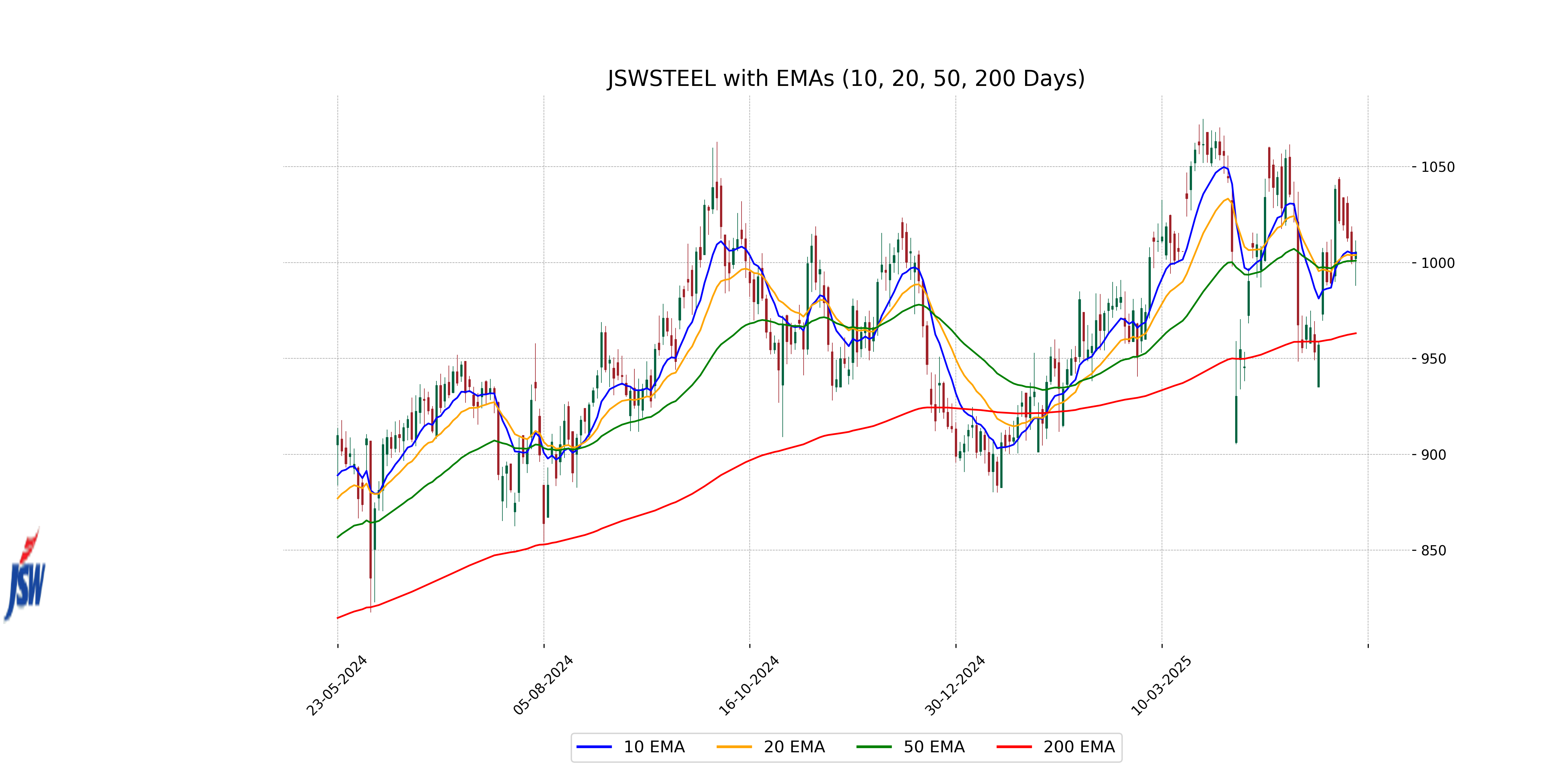 JSW Steel's current close price of 1005.60 is slightly above its 50 EMA of 1000.99, indicating a short-term positive sentiment. The close price is also above the 200 EMA of 963.13, suggesting long-term bullish momentum. Additionally, it's nearly aligned with the 10 EMA of 1005.05, showing consistency with shorter-term trends.