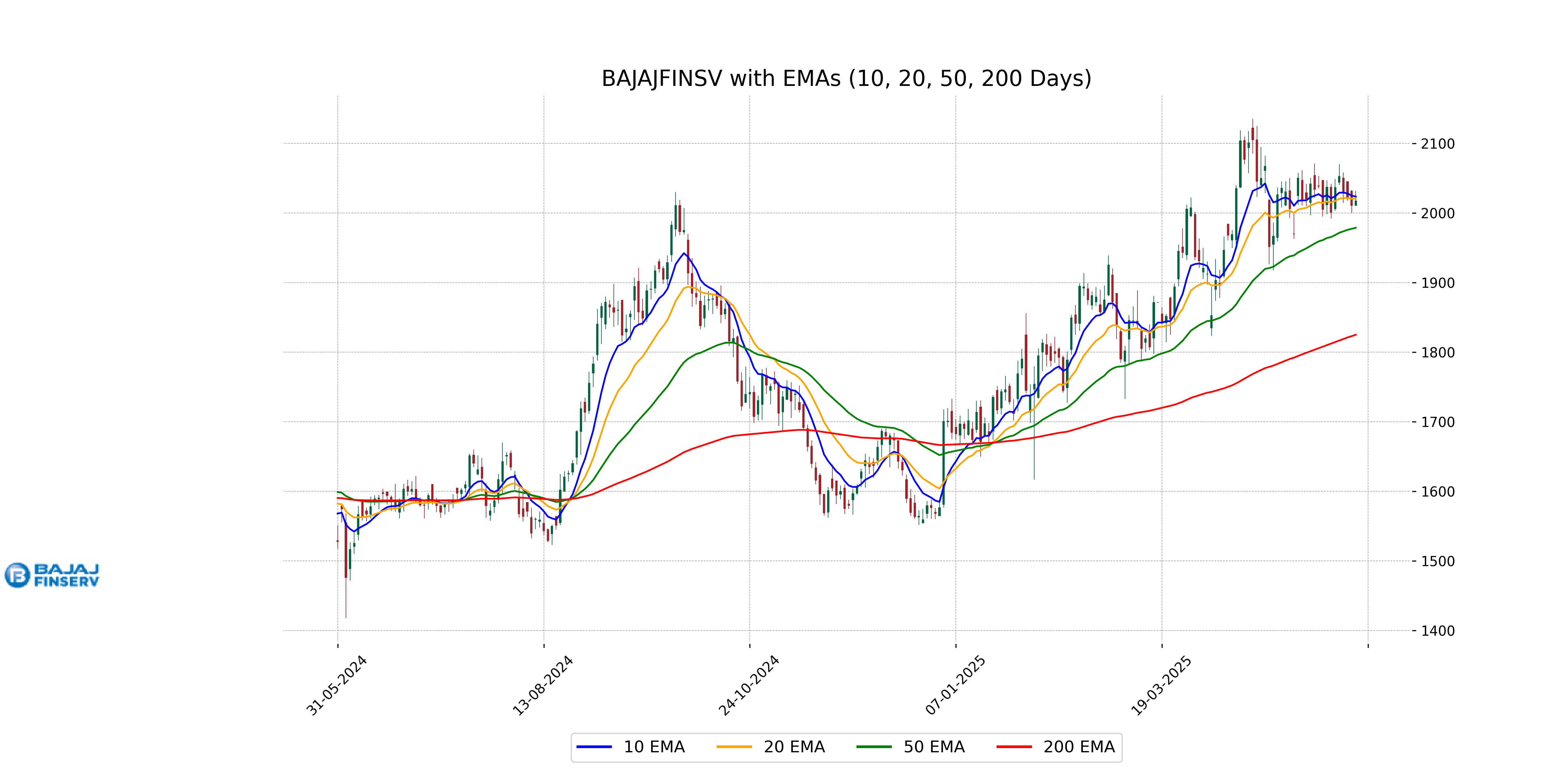 Performance Overview: Bajaj Finserv opened at 2010.90, reaching a high of 2031.70 and closing at 2017.40. This represents a 0.32% increase from the previous close of 2010.90, with a volume of 2,143,916 shares traded. The stock shows a steady upward trend, with a 50-day EMA of 1978.71 surpassing the 200-day EMA of 1824.97, indicating positive momentum in the Financial Services sector in India.