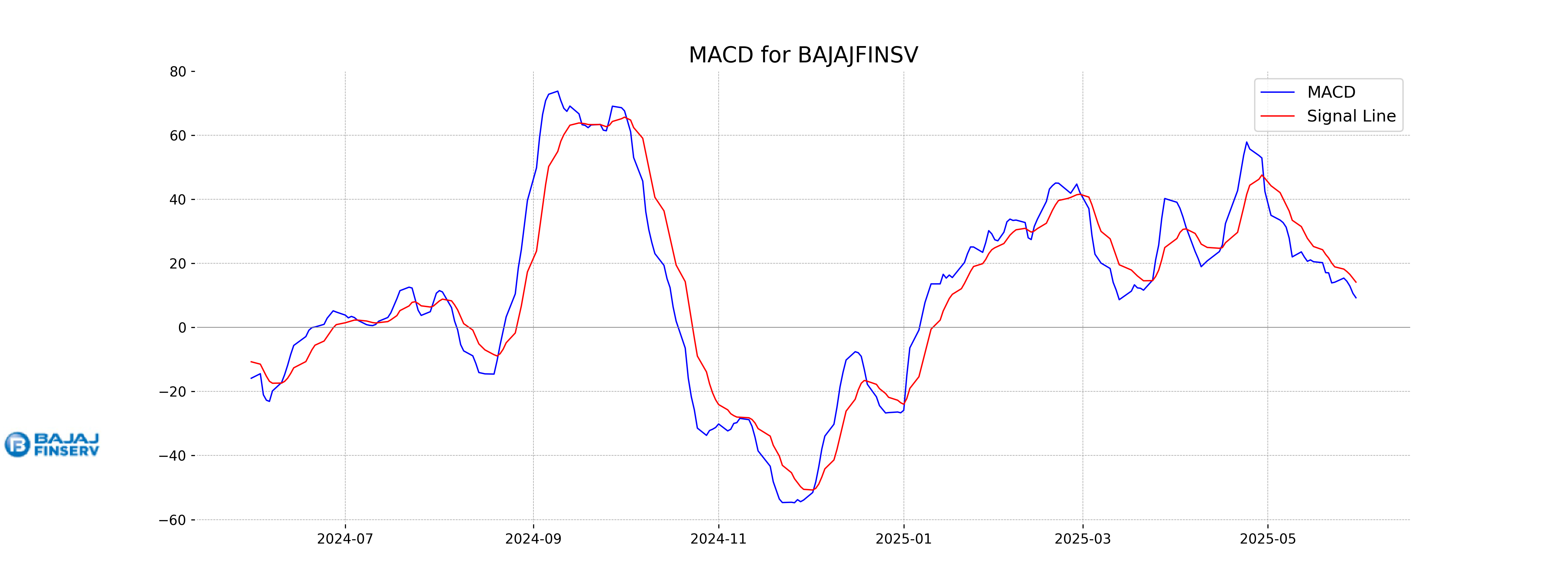 Bajaj Finserv: The MACD value is 9.25, which is below the MACD Signal value of 14.13. This suggests a potentially bearish signal as the MACD line is below the signal line, indicating a possible downward momentum in the stock's price movement.