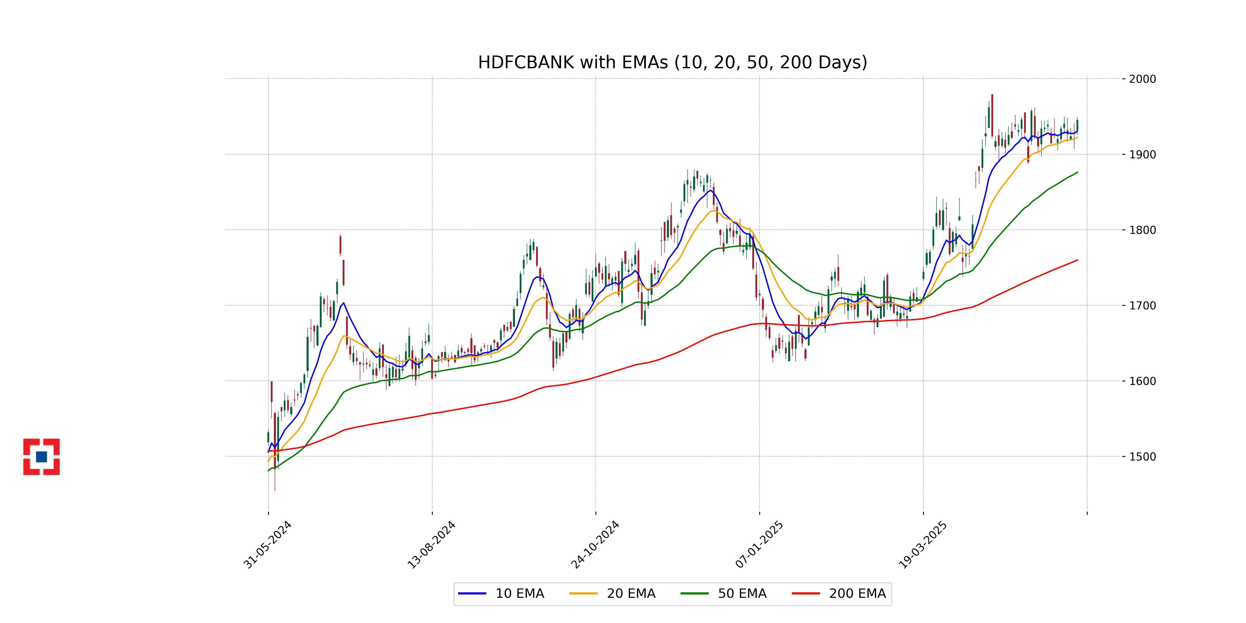 HDFC Bank closed at 1944.90, which is above its 50-day EMA of 1876.13 and its 200-day EMA of 1759.81, indicating a potential bullish trend. Additionally, the closing price is slightly above the 10-day EMA of 1930.67 and the 20-day EMA of 1922.32, suggesting recent upward momentum.