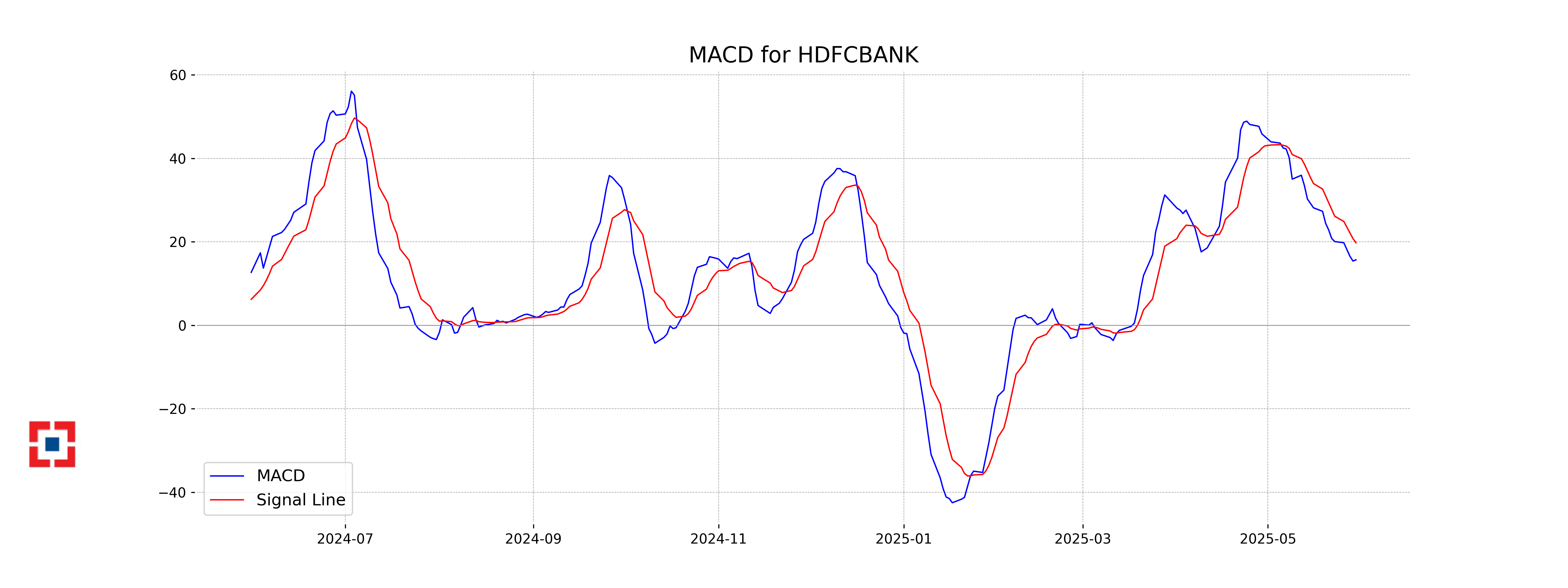 The MACD value for HDFC Bank is 15.70, which is below the MACD Signal line at 19.78. This suggests a bearish signal, indicating potential downward momentum as the MACD line is trending below the signal line. However, monitoring changes is recommended as it can quickly shift with new market dynamics.