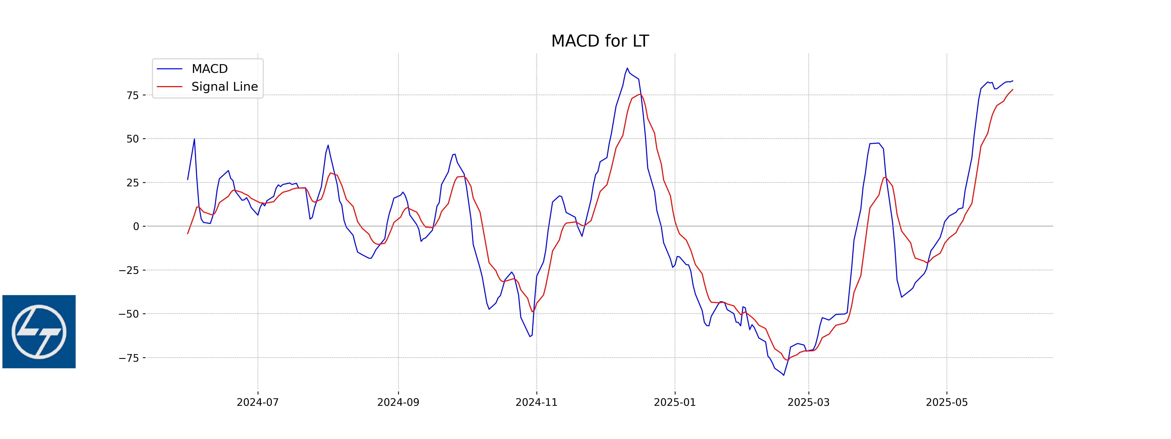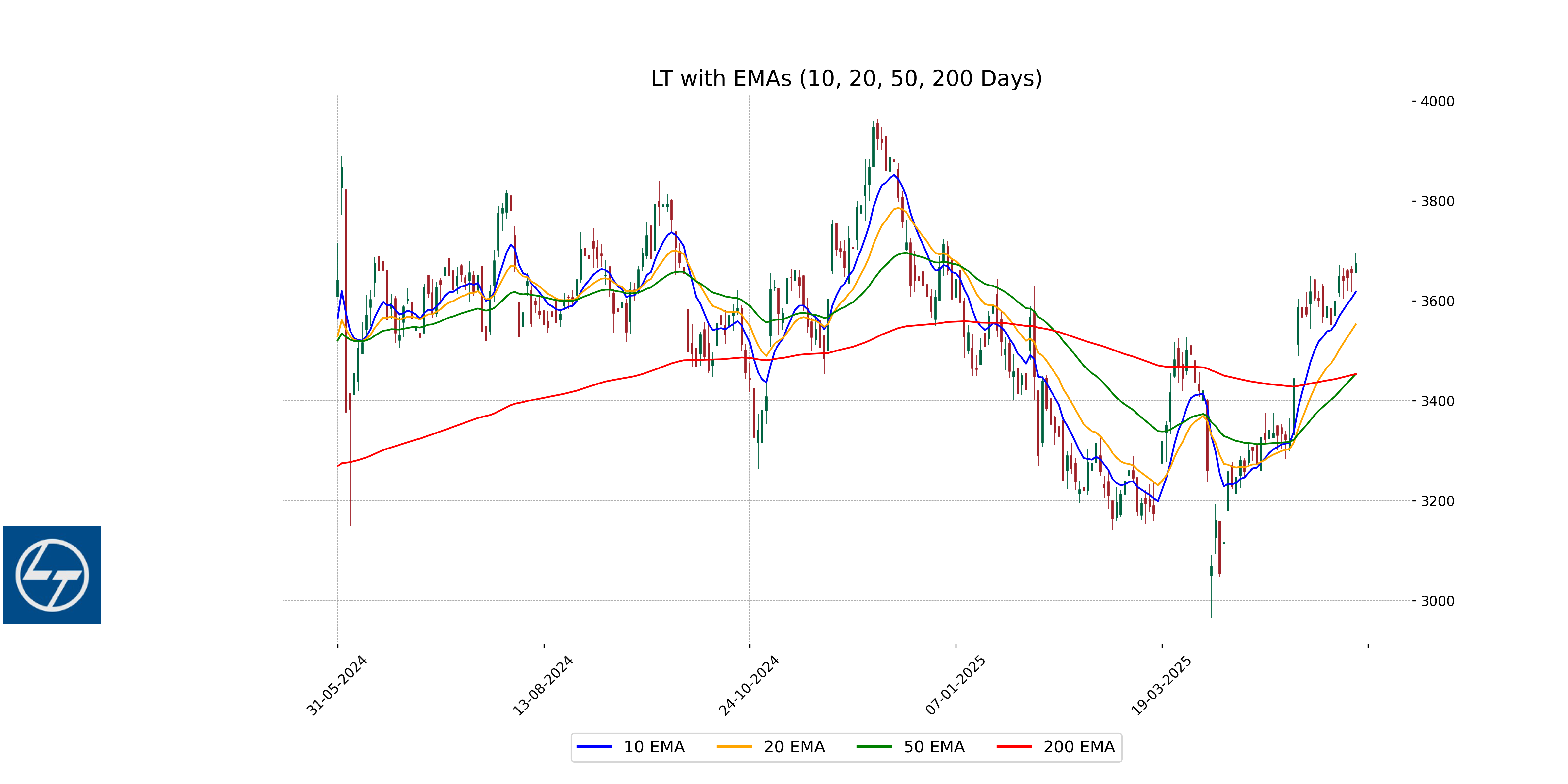 Larsen & Toubro is trading above its 50-day and 200-day EMAs, suggesting a strong upward trend. Its current price of 3675.10 is also above the 10-day and 20-day EMAs, indicating recent positive momentum in the Industrials sector within Engineering & Construction.