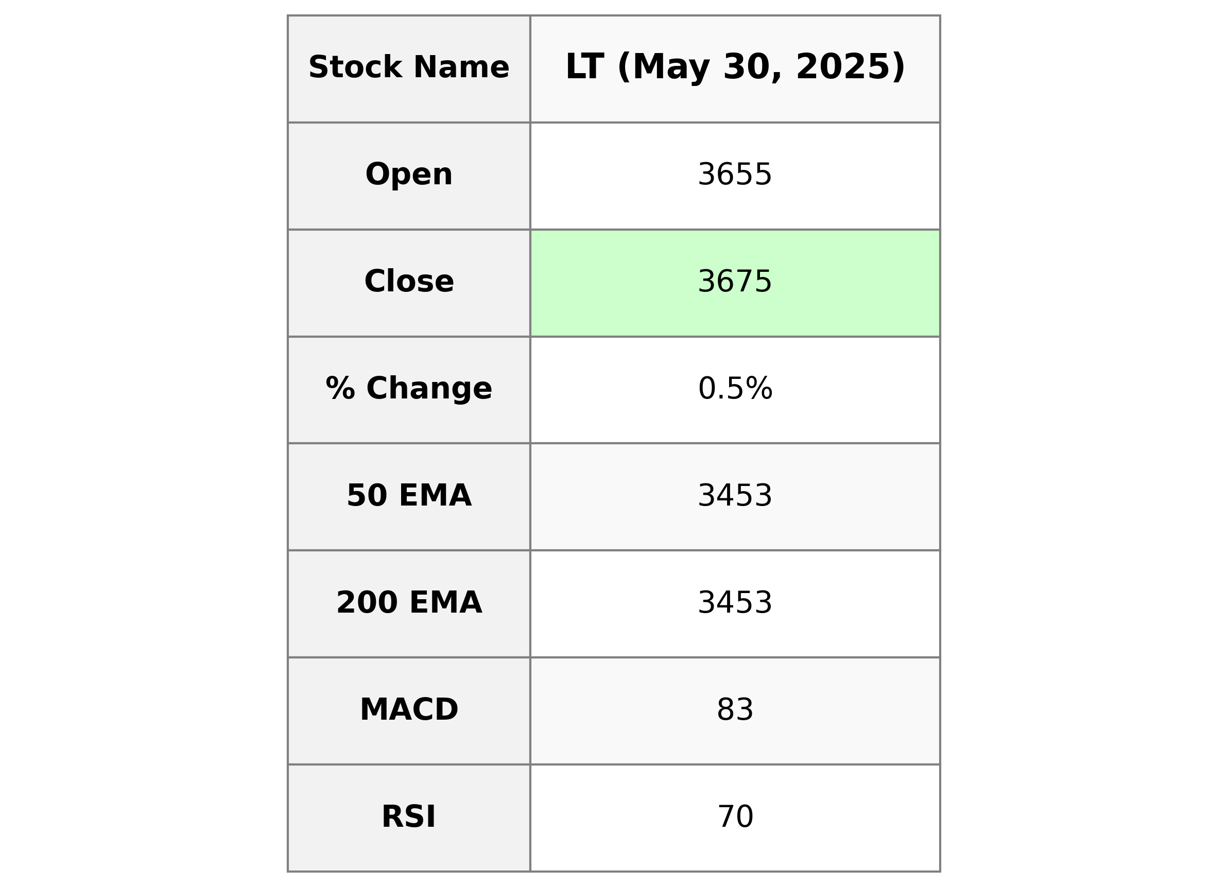 ### Stock Details - Open: 3655.30 - High: 3695.00 - Low: 3654.50 - Close: 3675.10 - Previous Close: 3655.30 - % Change: 0.54% - Points Change: 19.80 - Volume: 2,571,065 - 50 EMA: 3453.44 - 200 EMA: 3453.40 - 10 EMA: 3617.75 - 20 EMA: 3552.77 - RSI: 69.67 - MACD: 82.99 - MACD Signal: 78.03 - Market Cap: 5,054,291,509,248 - PE Ratio: 33.63 - EPS: 109.29 - Sector: Industrials - Industry: Engineering & Construction - Country: India ### Performance Summary The company's stock showed a positive performance, opening at 3655.30 and closing at 3675.10, resulting in a minor upward change of 0.54%. Significant technical indicators like EMA and RSI suggest a strong market position, with a notable market cap showcasing its industry presence in India.
