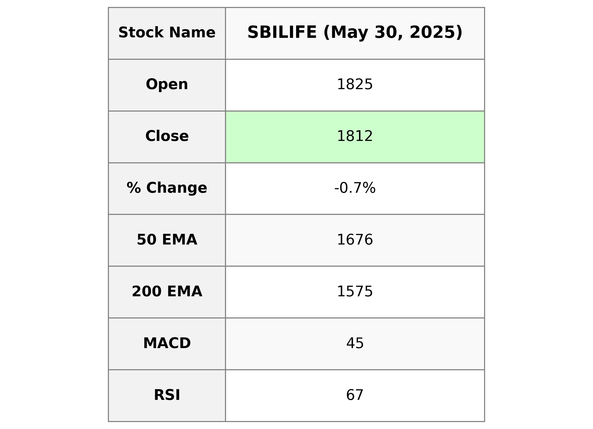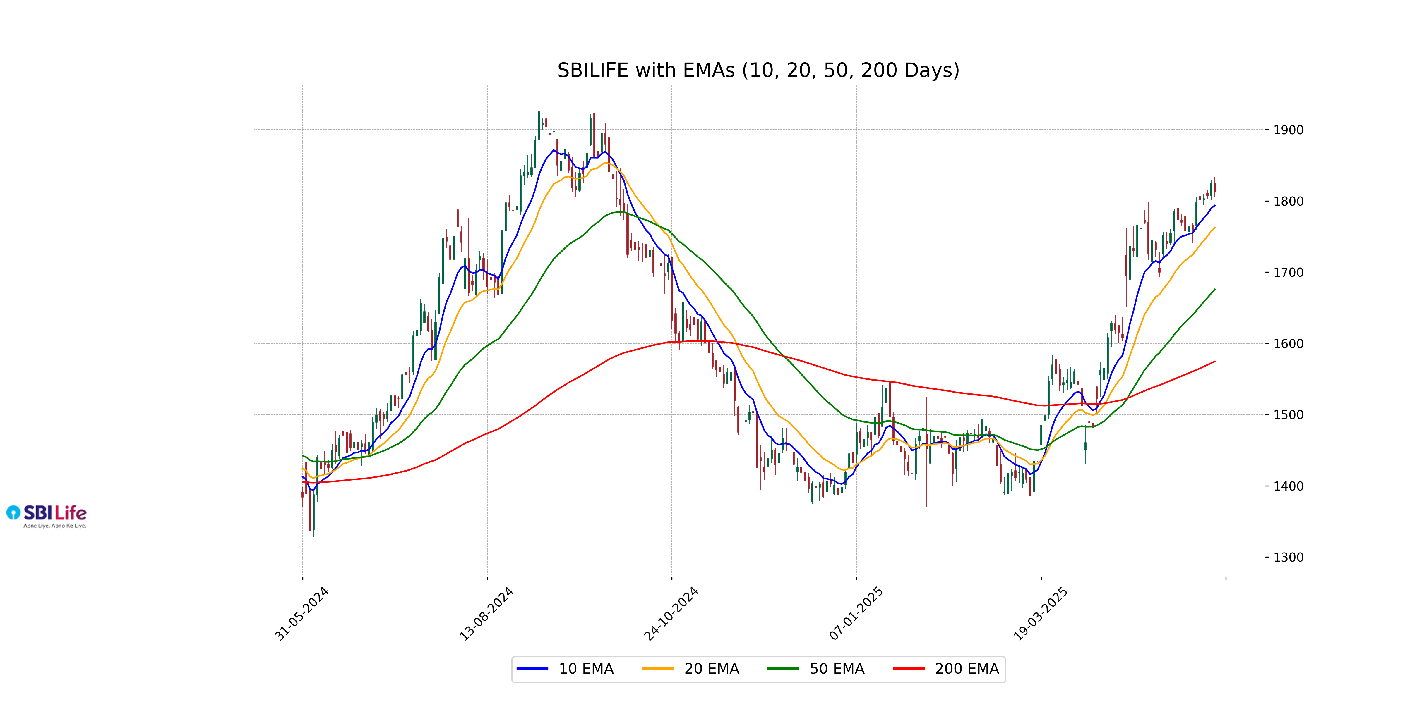 SBI Life's current closing price of 1812.20 is above its 10-day EMA of 1793.62 and significantly higher than the 50-day EMA of 1675.76 and the 200-day EMA of 1574.63. This indicates a short-term upward momentum, despite being slightly lower than the previous close.
