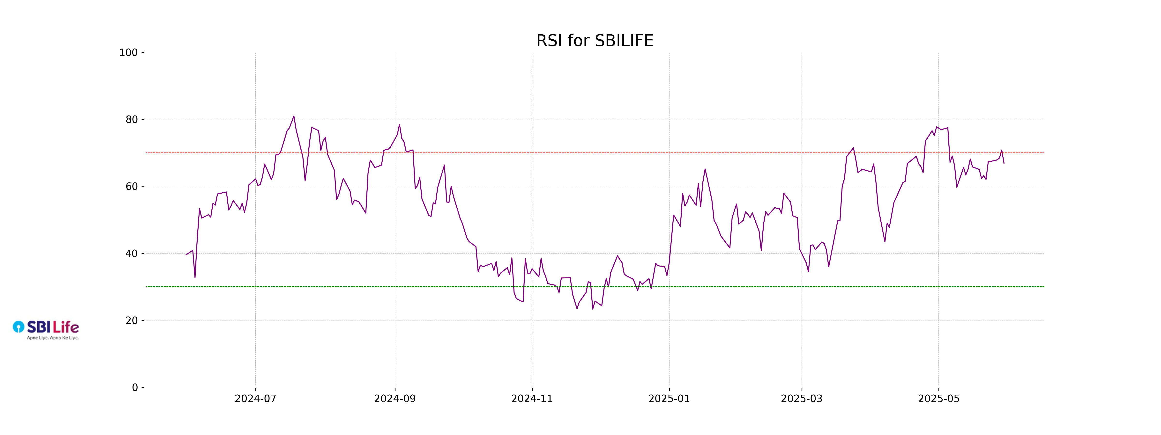 SBI Life currently has an RSI of 66.88, indicating a moderately strong momentum. The RSI is close to the overbought threshold of 70, suggesting that the stock may experience a price consolidation or a minor pullback in the near term. However, it's not yet in the overbought zone.