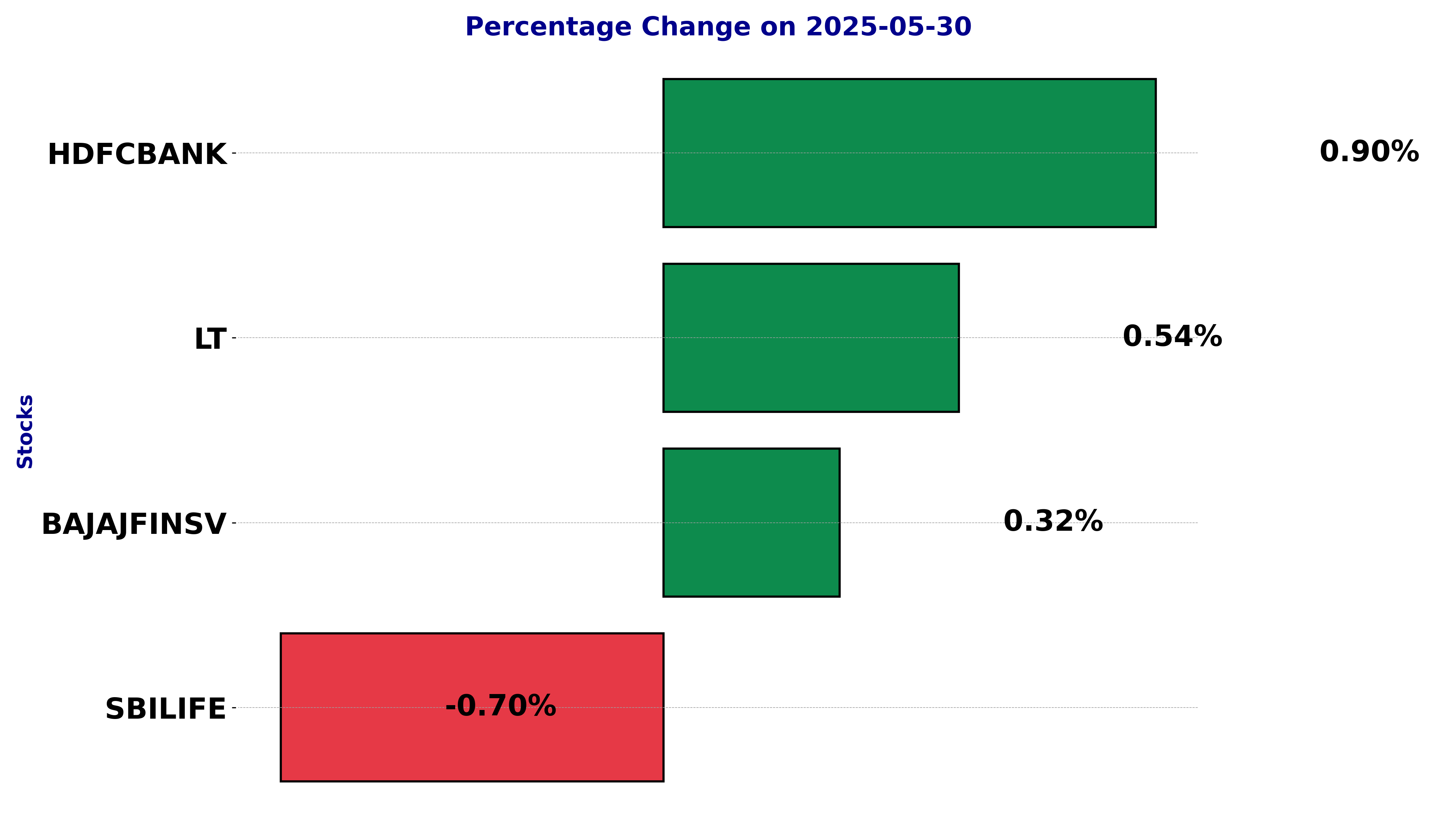 A detailed technical analysis of top-performing Indian stocks—Bajaj Finserv, HDFC Bank, L&T, and SBI Life—using key indicators like EMA, RSI, and MACD to assess market momentum and trend direction as of May 30, 2025.