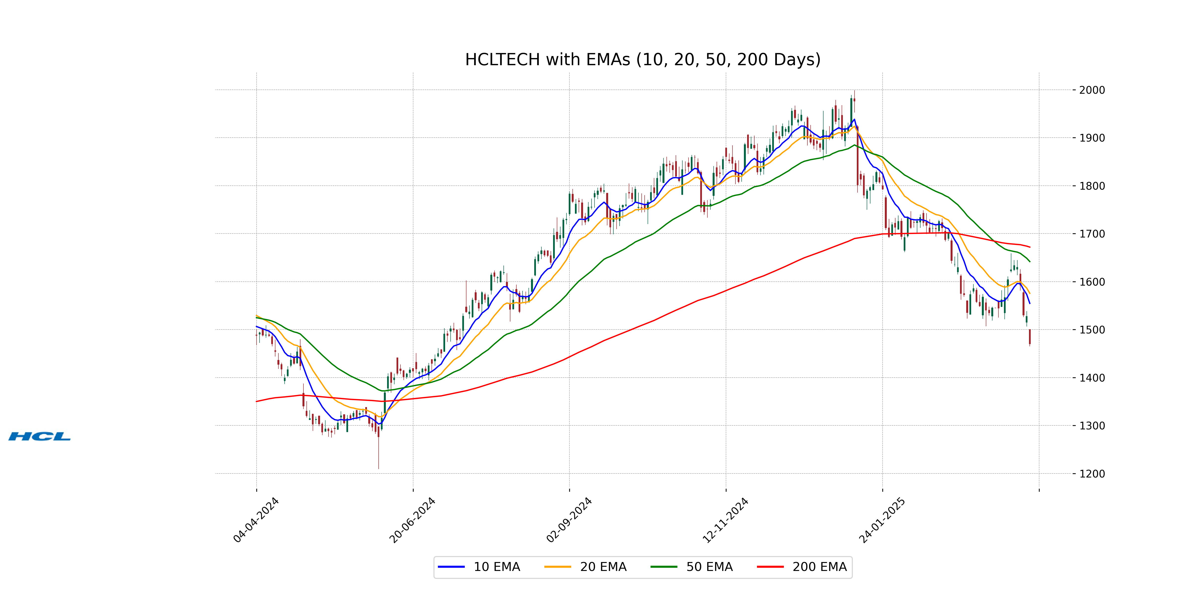 HCL Technologies' current closing price of 1470.10 is below its 50 EMA of 1641.81 and its 200 EMA of 1671.95, suggesting a bearish trend relative to these key moving averages. The 10 EMA of 1554.70 is also higher than the closing price, which further emphasizes the stock's short-term bearish momentum.