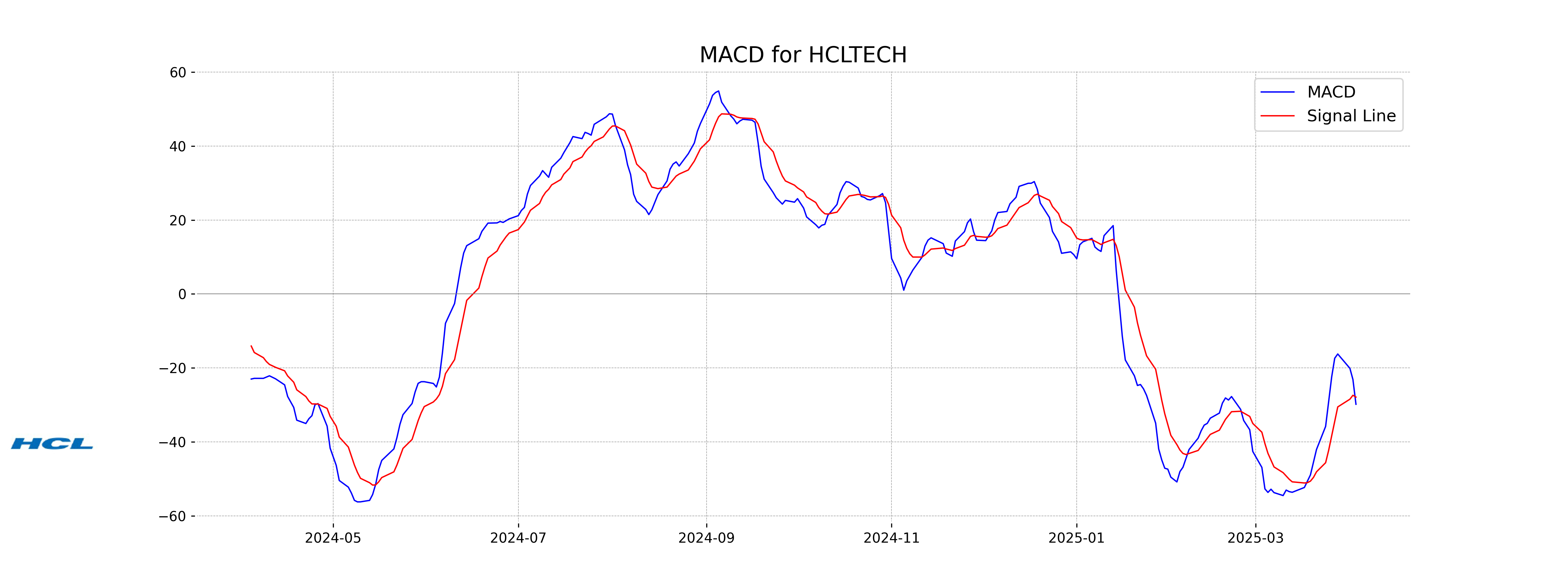 Based on the MACD analysis for HCL Technologies, the MACD value of -29.82 is lower than the signal line value of -27.87, suggesting bearish momentum. With the RSI at 28.94, it indicates the stock may be in oversold territory, potentially hinting at a reversal or consolidation.