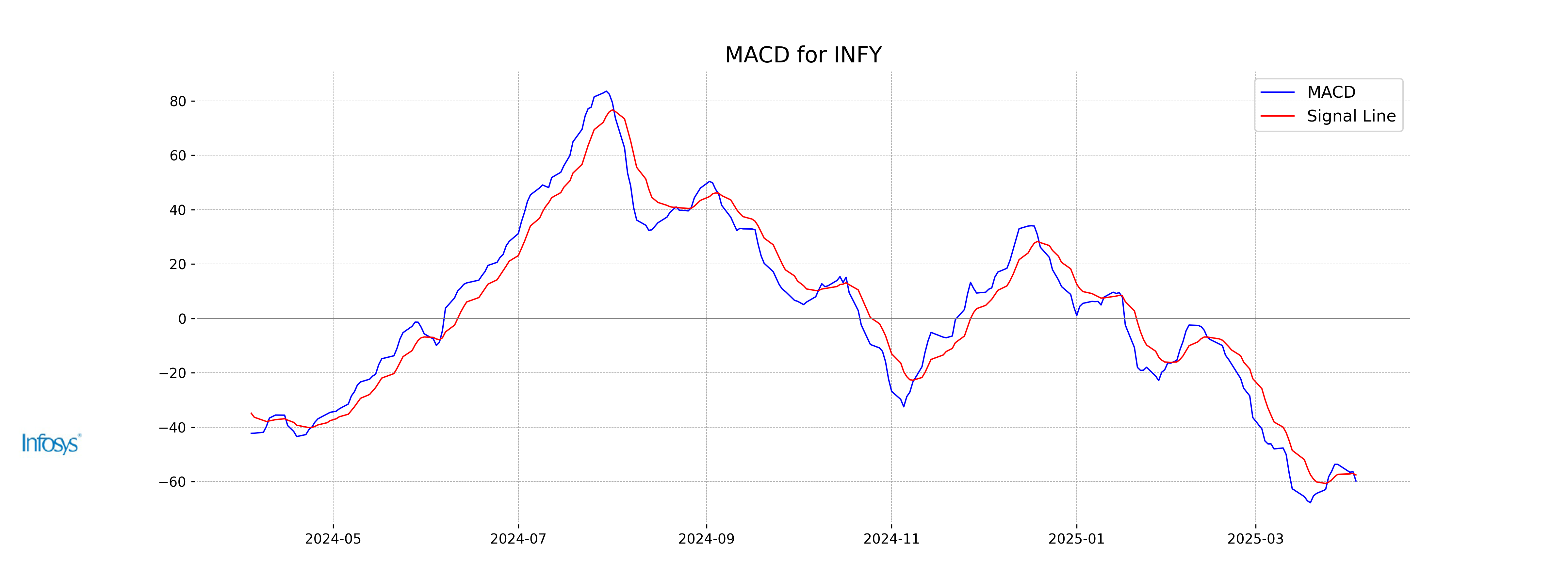 The MACD for Infosys is currently at -59.75, with a signal line of -57.54. This indicates a bearish momentum as the MACD is below the signal line, suggesting that the stock is experiencing a downward trend.