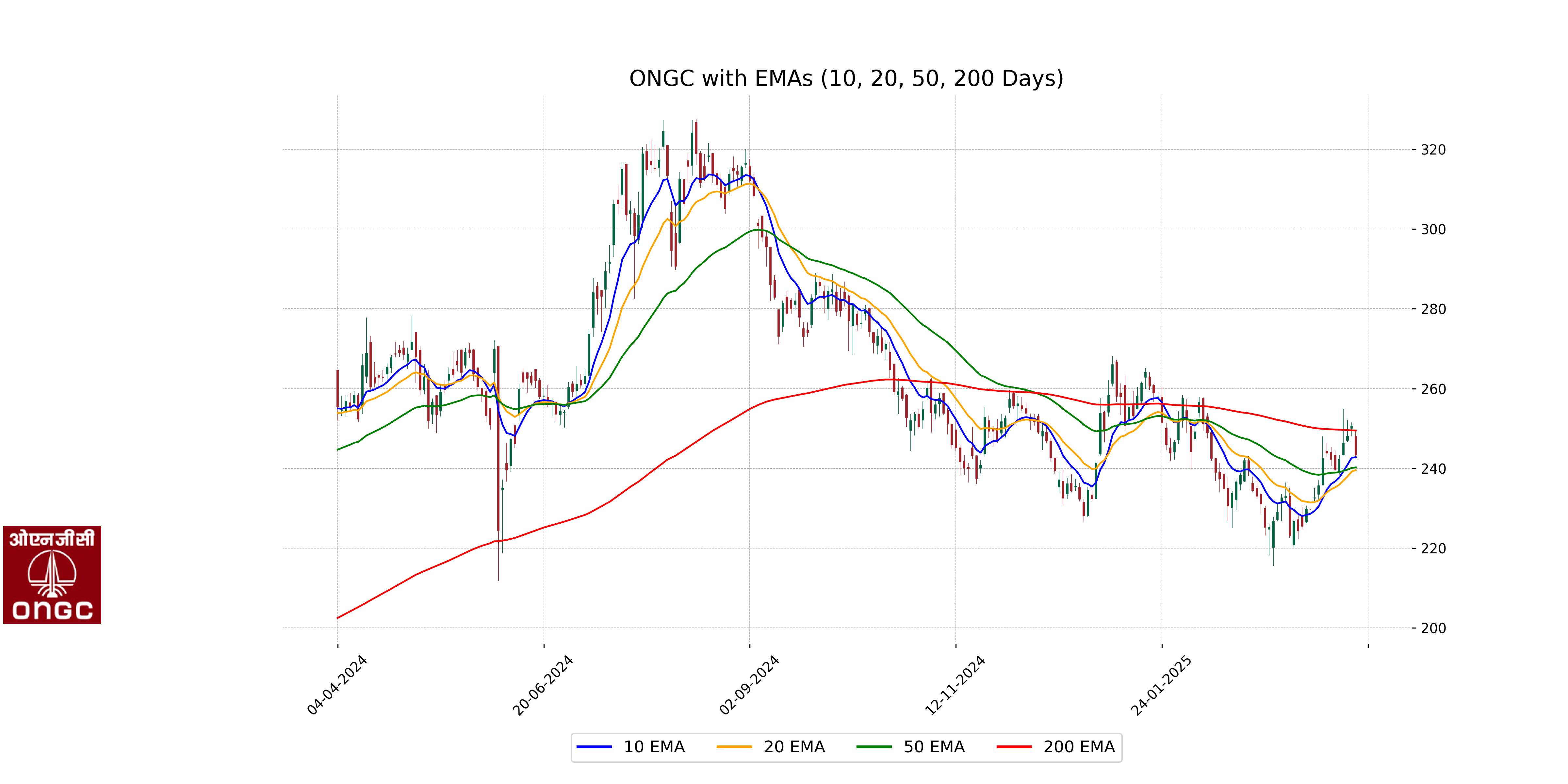 Based on the provided data for ONGC, the current close price of 243.31 is slightly above the 50-day EMA of 240.22 but below the 200-day EMA of 249.47. This suggests a short-term bullish trend while still indicating caution against a longer-term bearish trend, as observed by the position below the 200-day EMA.