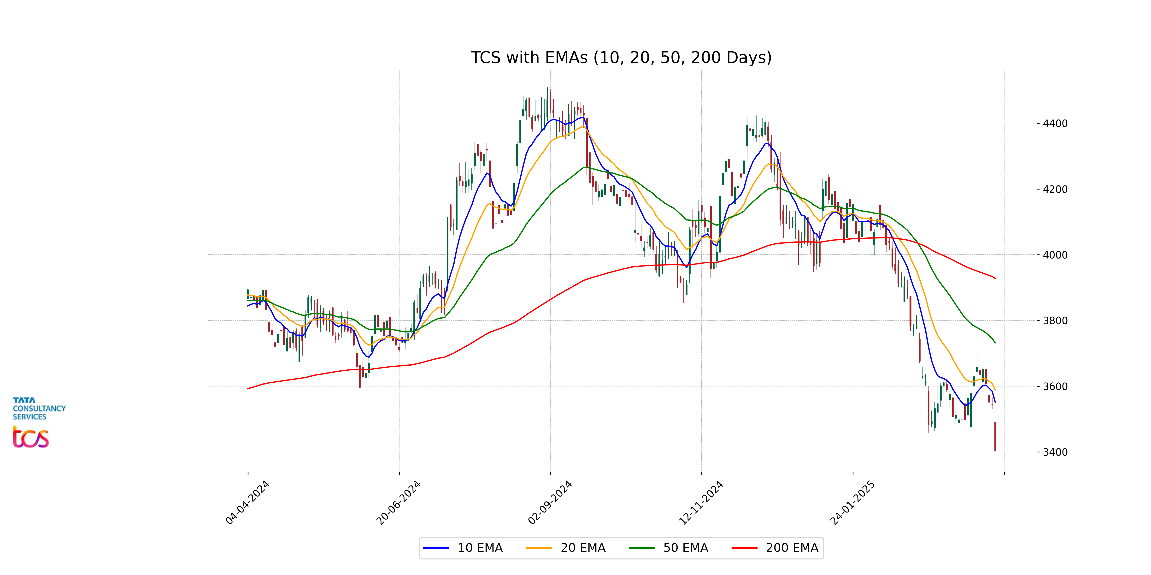 The stock price of TCS is trading below its 50-day and 200-day Exponential Moving Averages (EMAs), indicating a bearish short-term and long-term trend. Additionally, it is also below the 10-day and 20-day EMAs, suggesting continued downward pressure in the recent term.