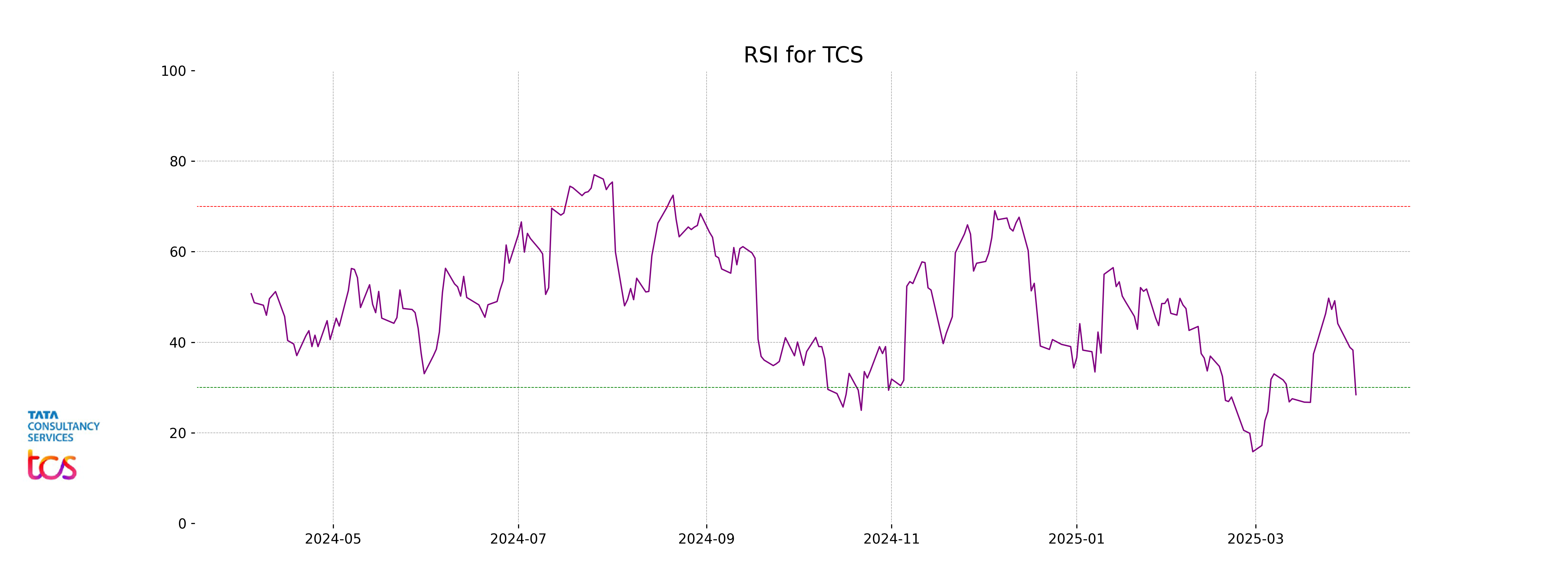 The RSI value for TCS is 28.41, which indicates that the stock is currently in an oversold condition. In general, an RSI below 30 suggests that the stock might be undervalued and could be poised for a potential reversal or upward movement. However, it's important to consider other indicators and the overall market condition before making any trading decisions.