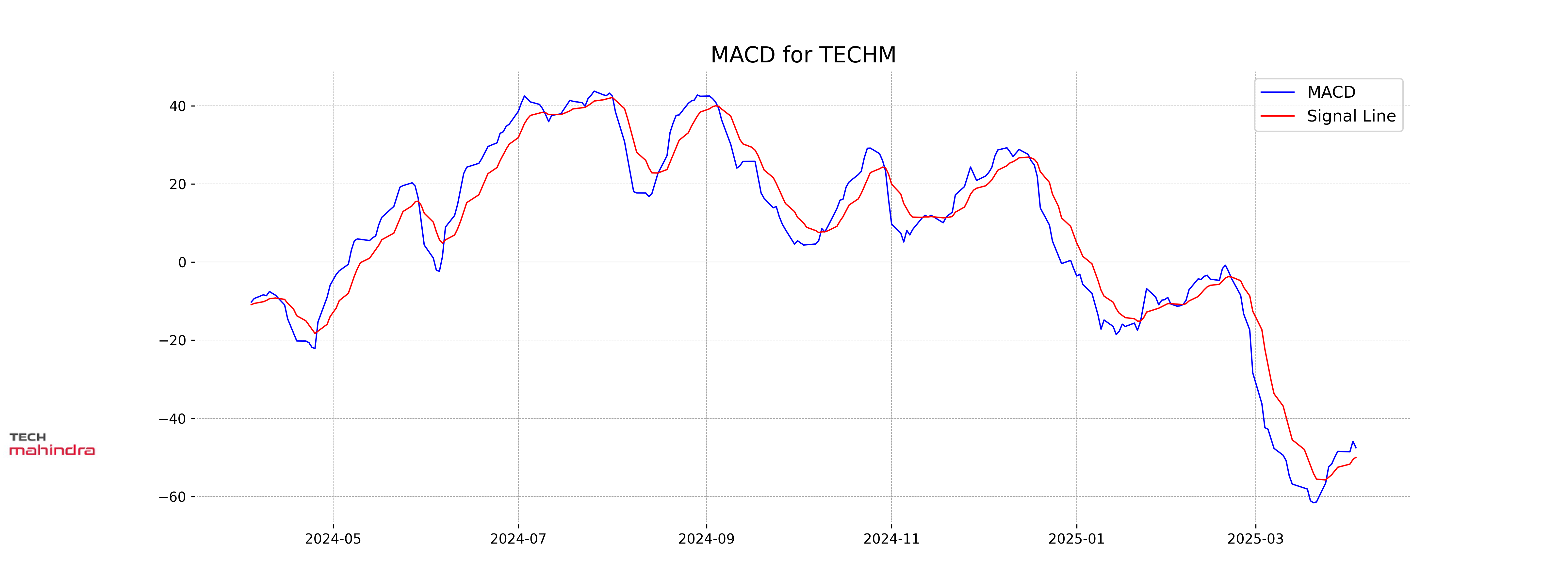 Tech Mahindra's MACD is at -47.54, with a signal line at -49.96, indicating a bearish momentum. The MACD is below the signal line, which suggests that the stock might continue in a downtrend.