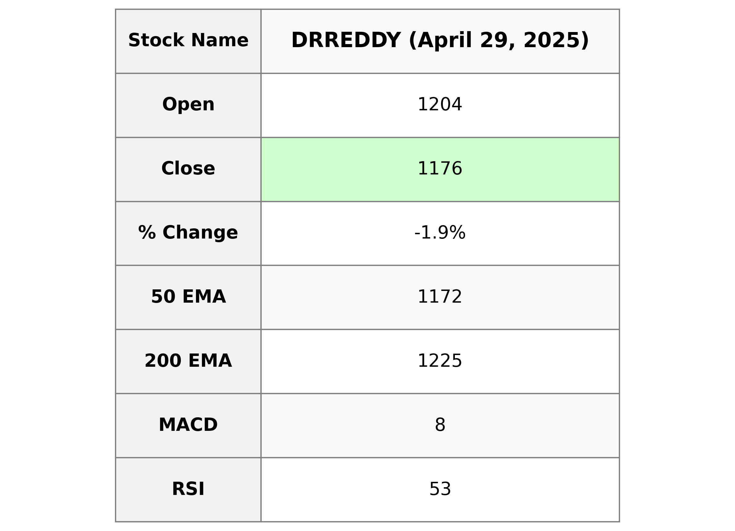 Dr Reddys Labs closed at 1176.0, slightly above its 50-day EMA of 1172.05 and its 10-day EMA of 1173.49, indicating a potential short-term bullish sentiment. However, it remains below the 200-day EMA of 1225.44, suggesting a longer-term bearish trend.
