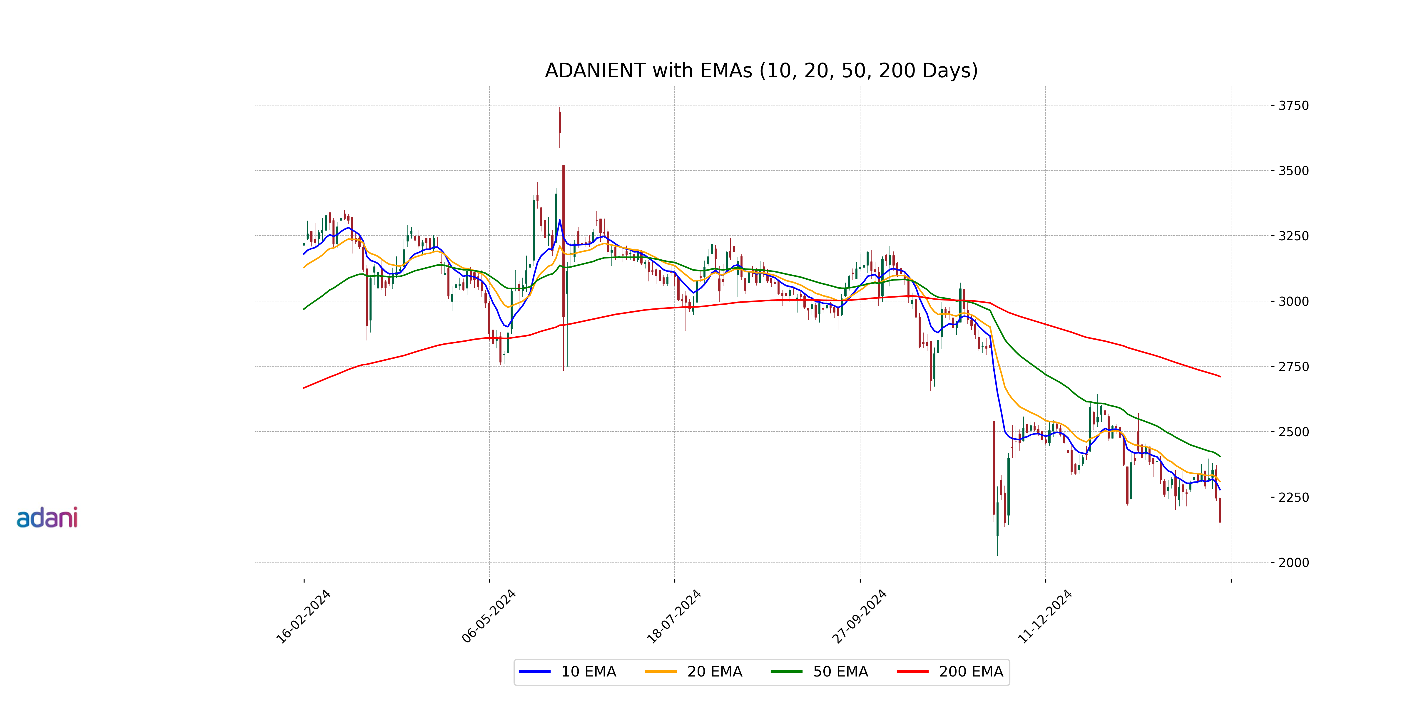 Adani Enterprises' stock is trading below its key moving averages, as indicated by its close price of 2152.65, which is under its 10-day EMA (2277.68), 50-day EMA (2405.21), and 200-day EMA (2710.67). This suggests a bearish trend in the short, medium, and long-term moving averages.