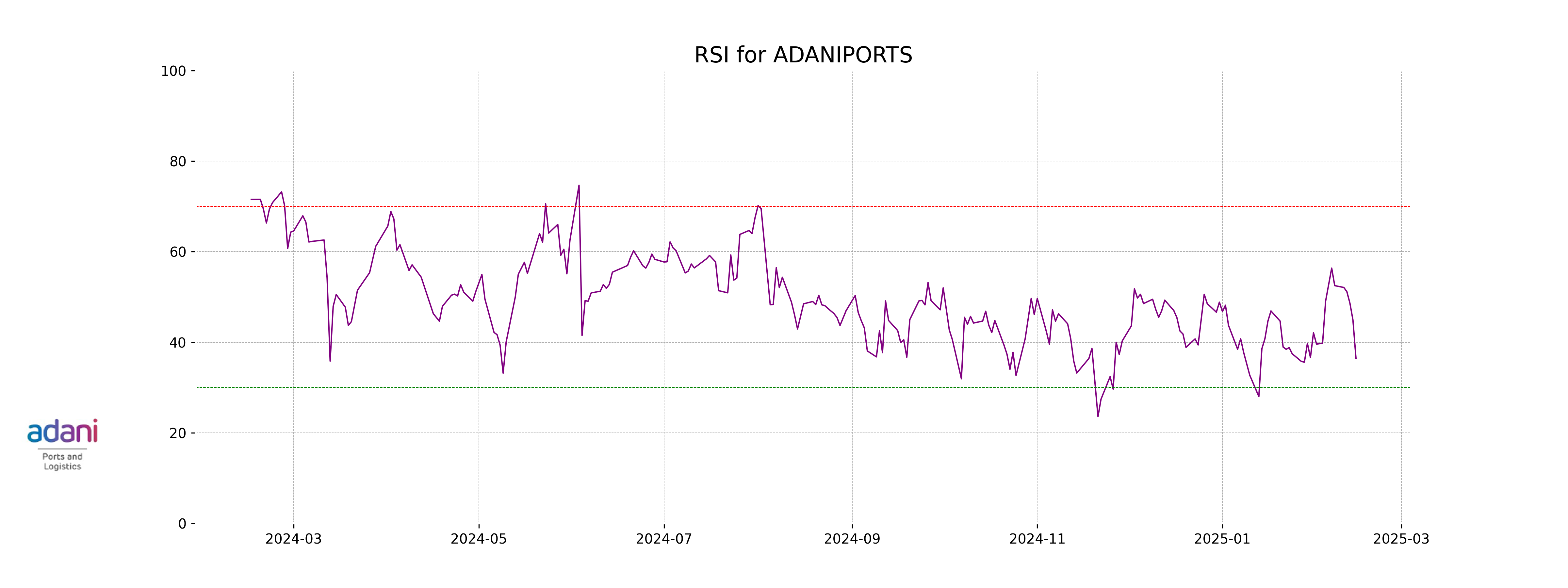 The RSI (Relative Strength Index) for Adani Ports is 36.48, indicating that the stock is in the lower range of the RSI scale, which suggests it is nearing oversold conditions. This may imply a potential buying opportunity if such conditions persist, as the stock appears to be under significant selling pressure.