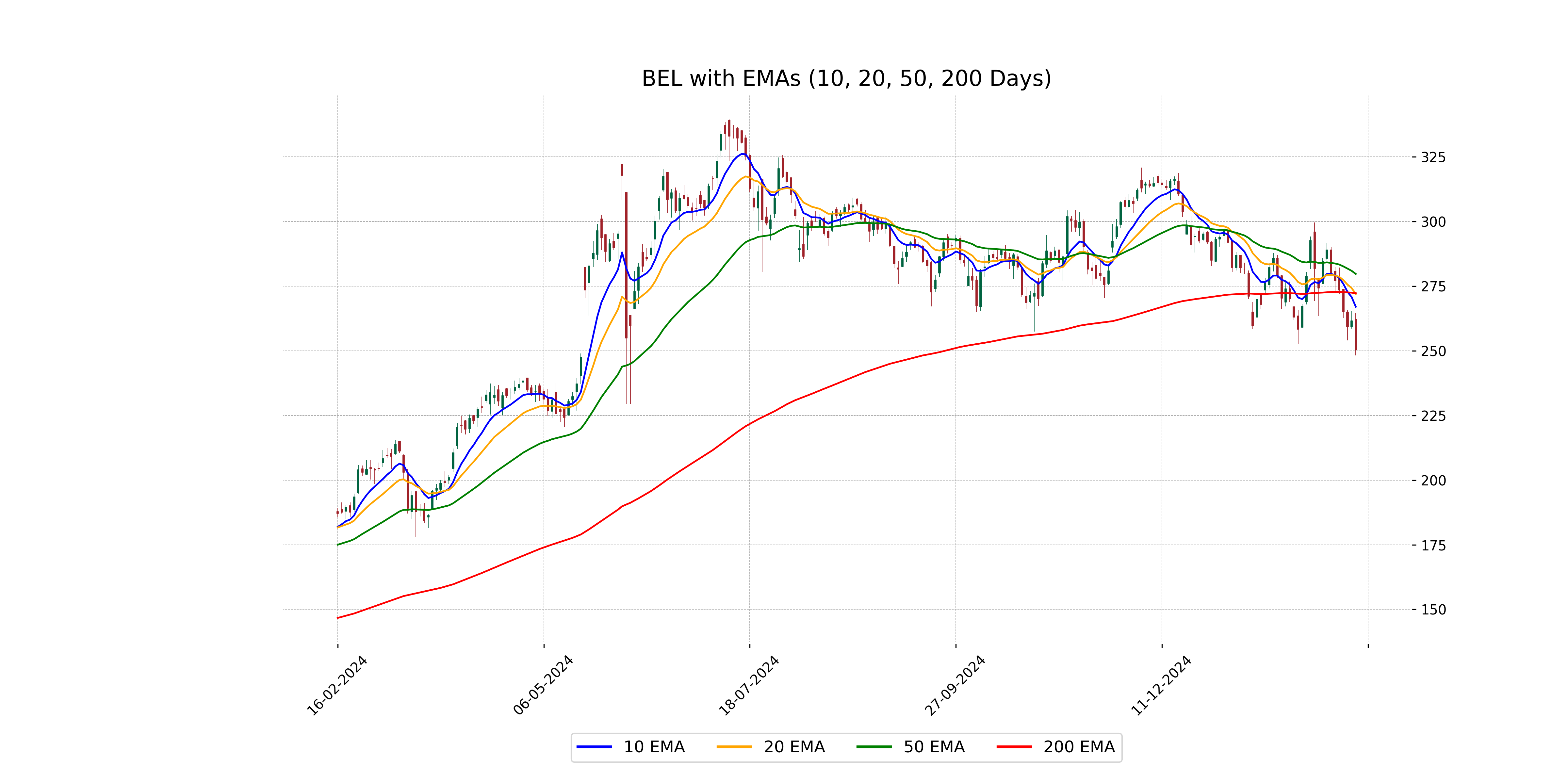 Bharat Electronics' current close price of 250.35 is below its key moving averages, including the 50 EMA at 279.69 and the 200 EMA at 272.23, suggesting a bearish trend. The 10 EMA at 267.02 and 20 EMA at 271.95 also indicate the stock is currently trading below shorter-term averages, reinforcing potential downward momentum.