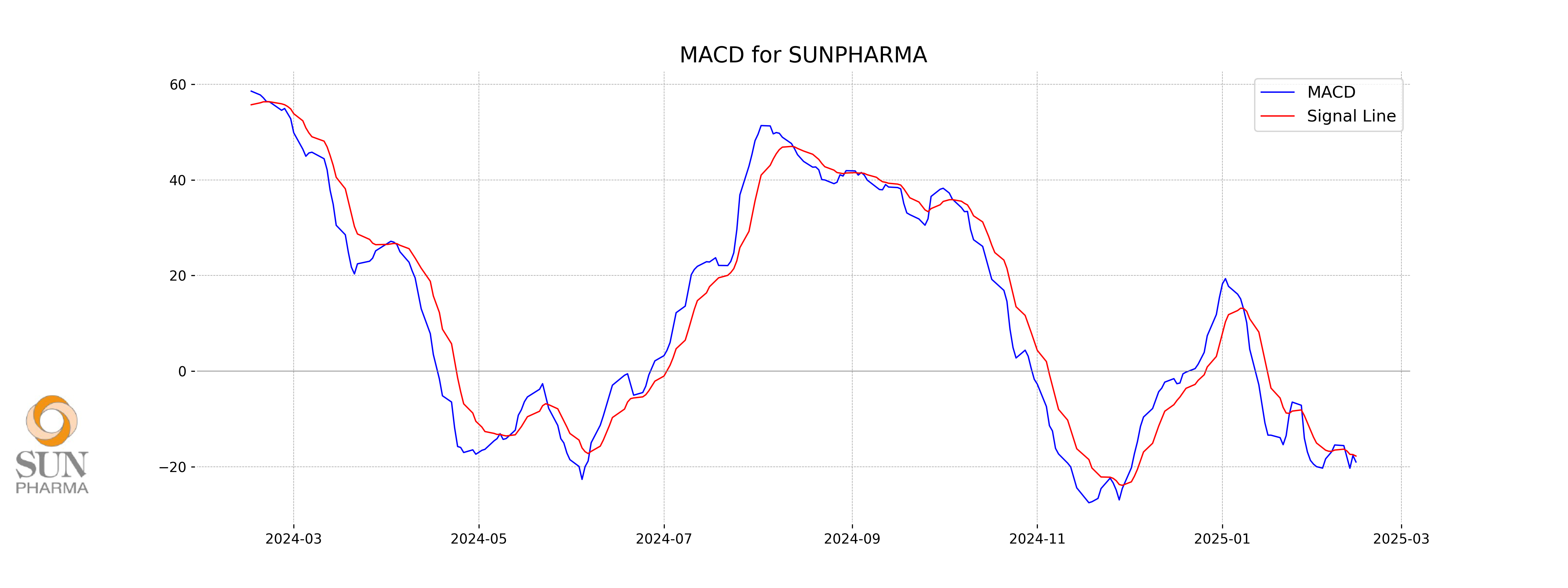 **MACD Analysis for SUN Pharma:** The MACD value is -18.99, while the MACD Signal is -17.76, which indicates a bearish momentum as the MACD line is below the signal line. The negative divergence suggests that the stock may be experiencing downward pressure.