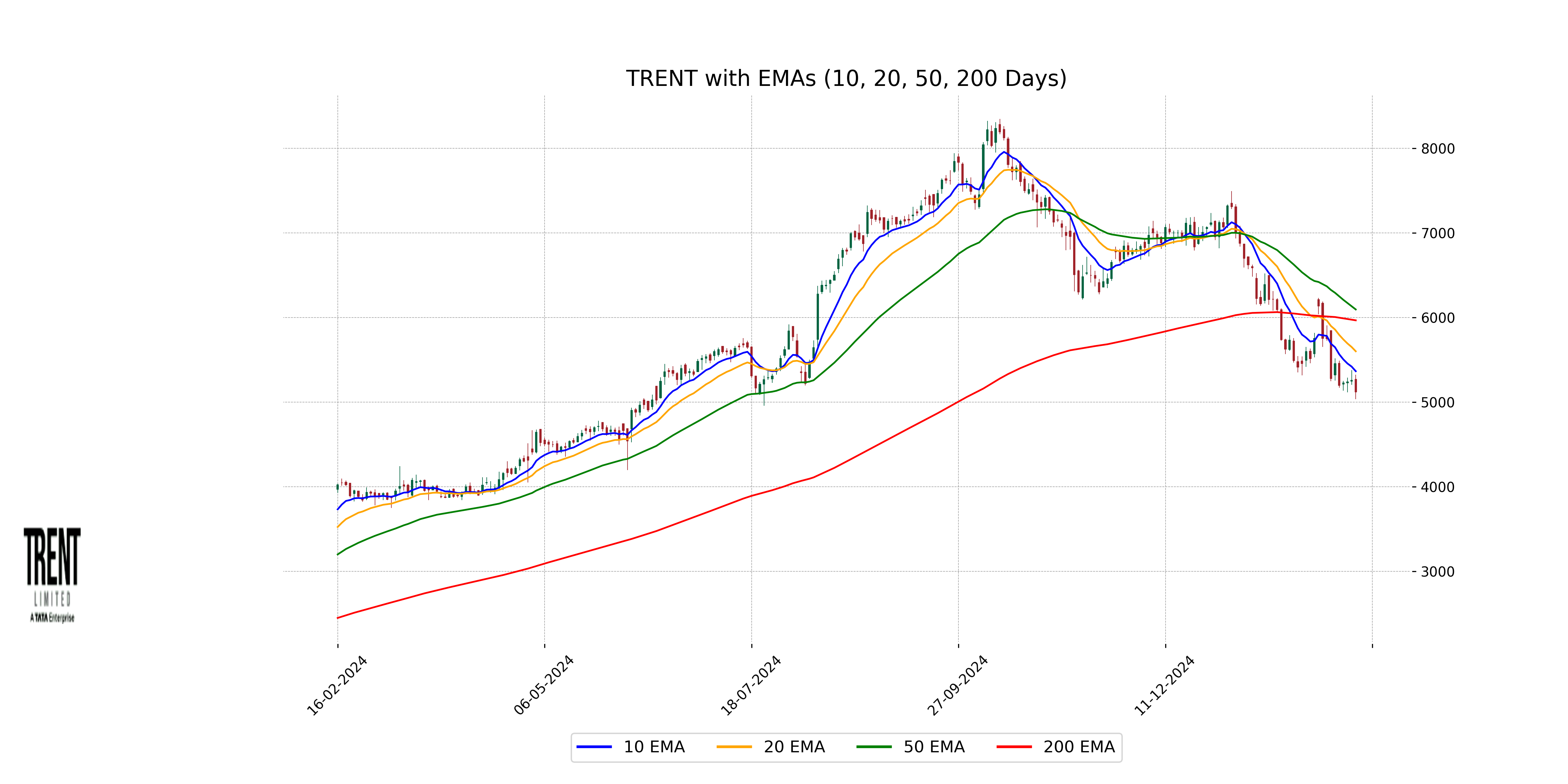 **Trent**'s current close price of 5117.35 is below its 50-day EMA of 6094.34 and 200-day EMA of 5965.88, indicating a bearish trend. Additionally, it is also below the 10-day EMA of 5364.47 and 20-day EMA of 5599.91, reinforcing short-term bearish momentum.