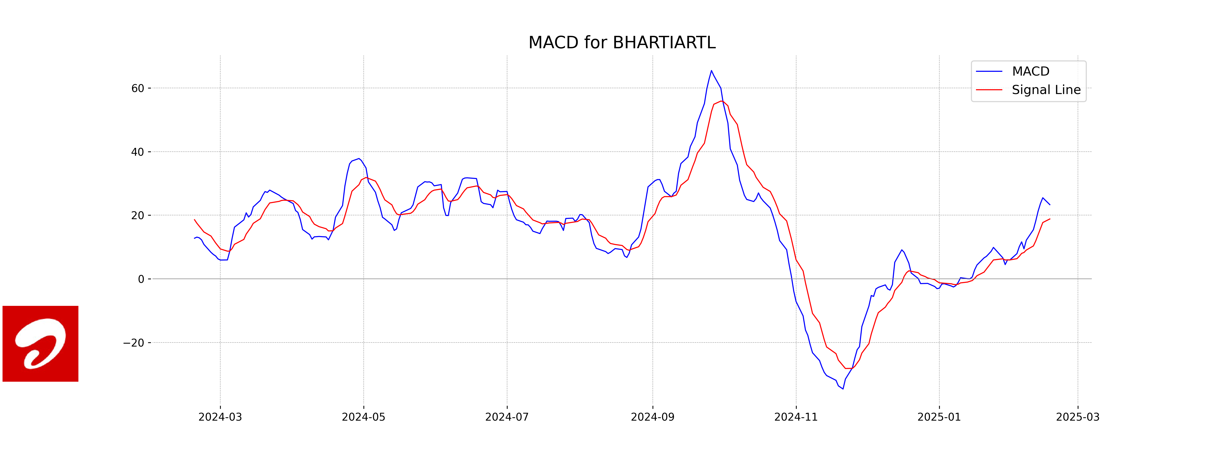 **MACD Analysis for Bharti Airtel** The MACD value for Bharti Airtel is 23.31, and the signal line is at 18.82, indicating a positive divergence. This suggests bullish momentum and the potential for upward price movement.