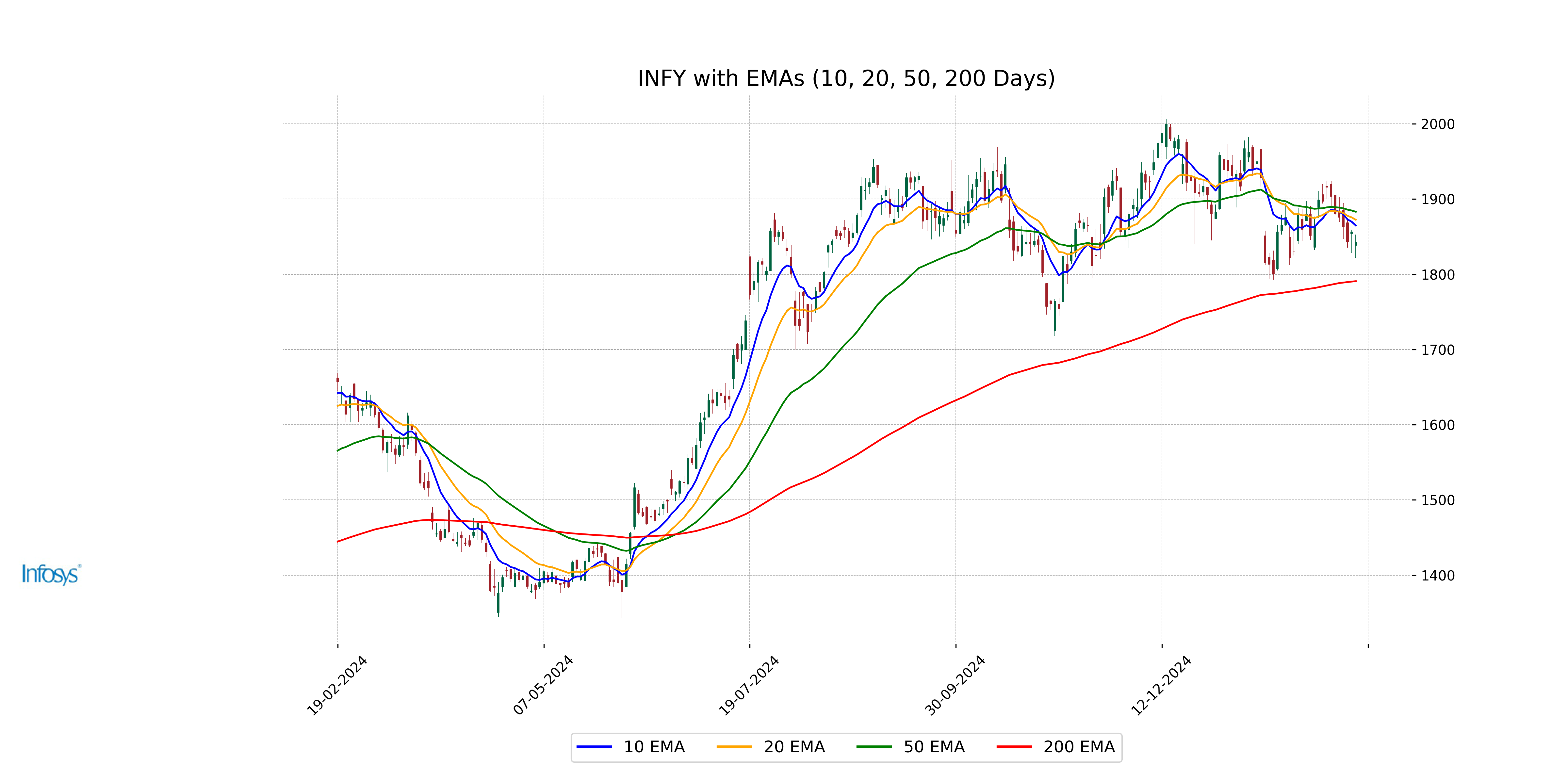 Infosys closed at 1842.30, which is below its 50-day EMA of 1883.13 and the 10-day EMA of 1864.90, indicating potential short-term bearish sentiment. However, it's still above the 200-day EMA of 1790.82, suggesting overall long-term trend support remains intact.