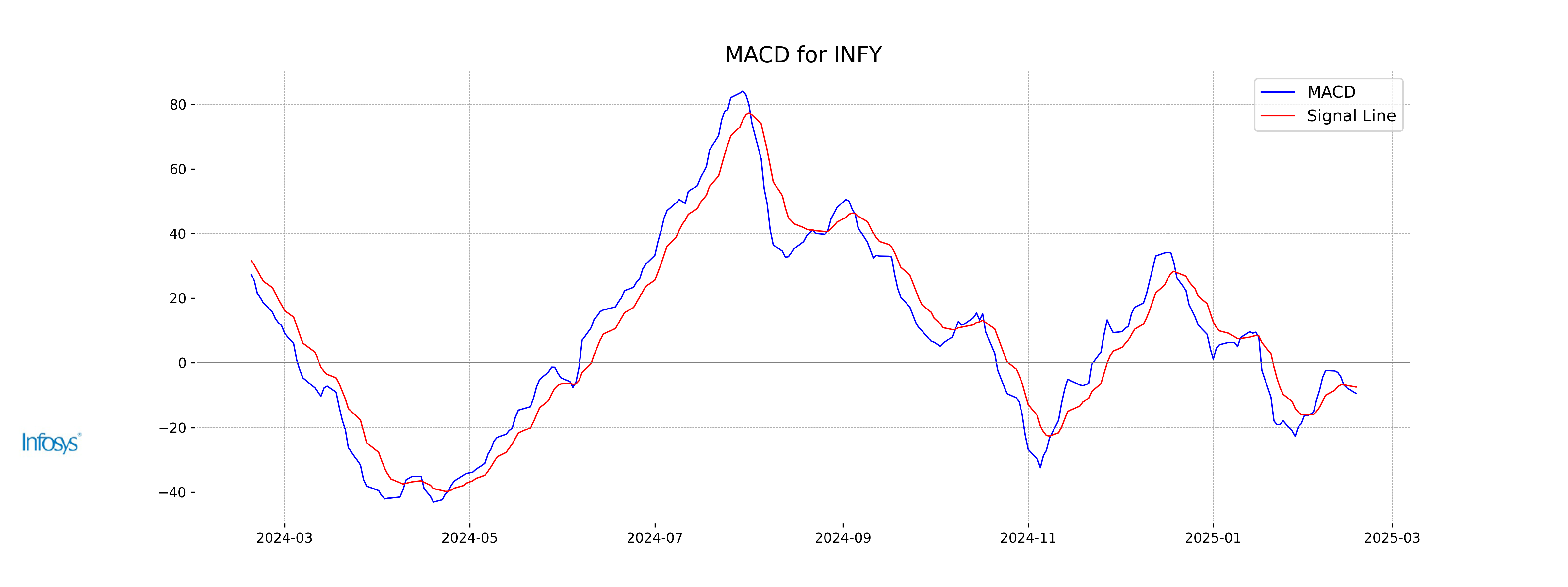 The MACD for Infosys is at -9.48, indicating a bearish momentum as it is below the signal line, which is at -7.50. This suggests that the stock might be experiencing downward pressure currently.