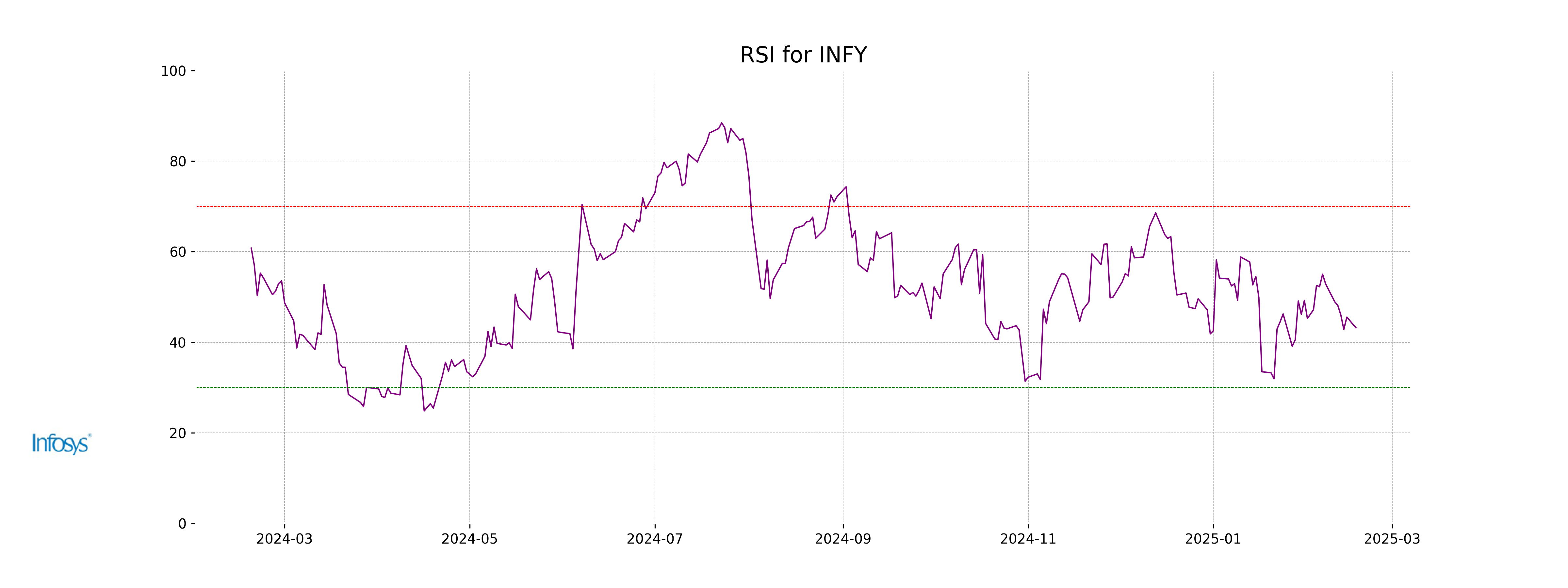 The RSI for Infosys is 43.18, which indicates that the stock is in a neutral zone, somewhat closer to being oversold. Typically, an RSI below 30 is considered oversold, while above 70 is considered overbought; hence, this suggests a need for monitoring the trend closely.