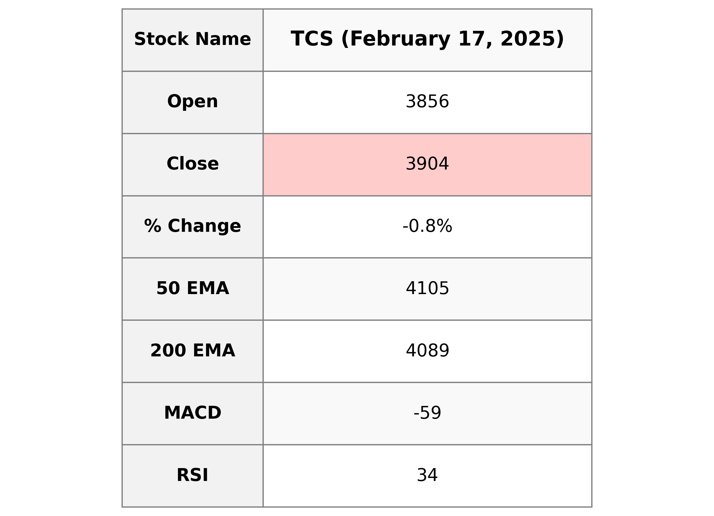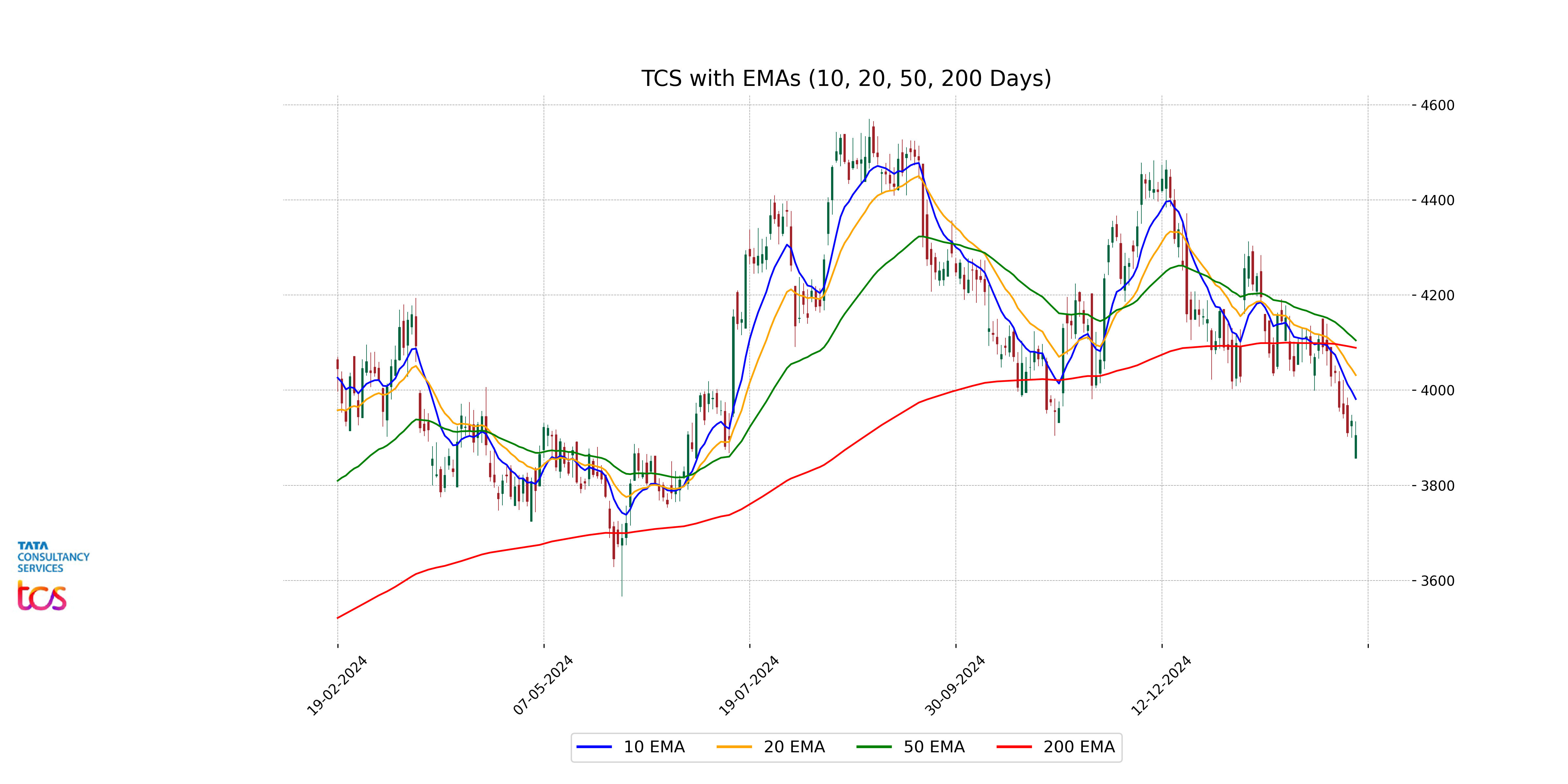For Tata Consultancy Services (TCS), the current close price of 3904.5 is below its key moving averages, including the 10 EMA at 3981.29, the 20 EMA at 4031.60, the 50 EMA at 4104.70, and the 200 EMA at 4089.11. This indicates a short-term bearish trend as the stock is trading below these averages.