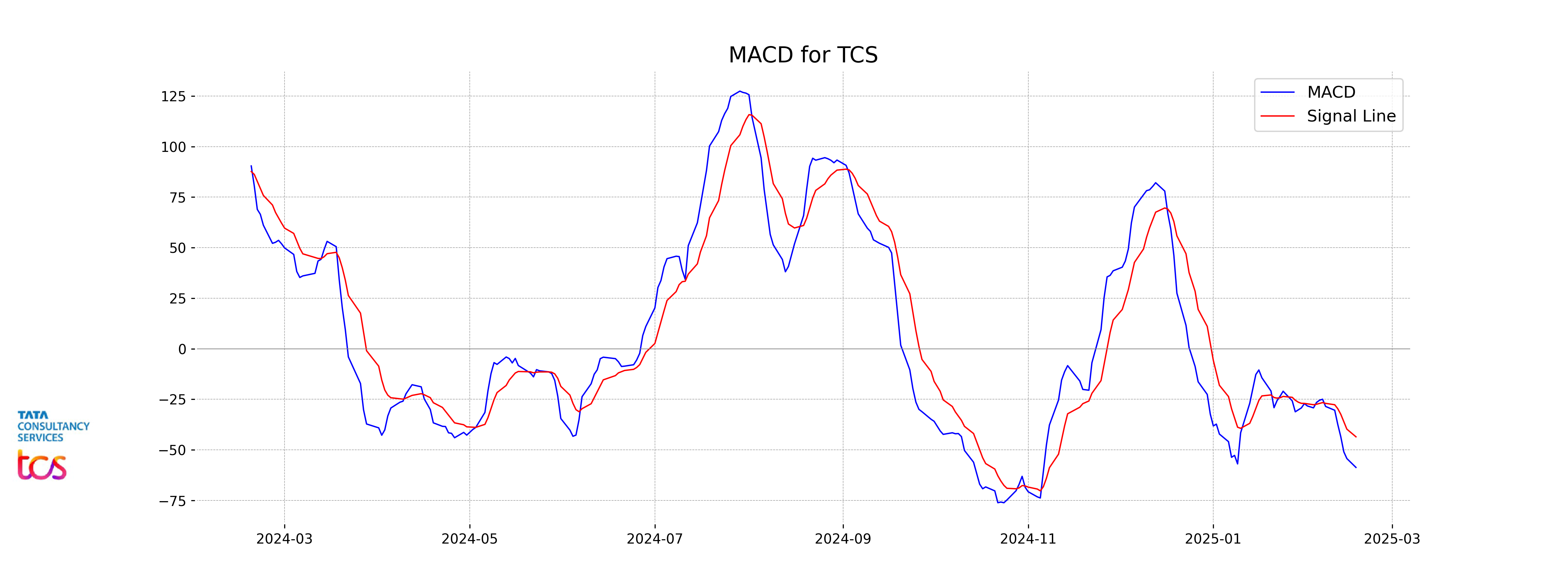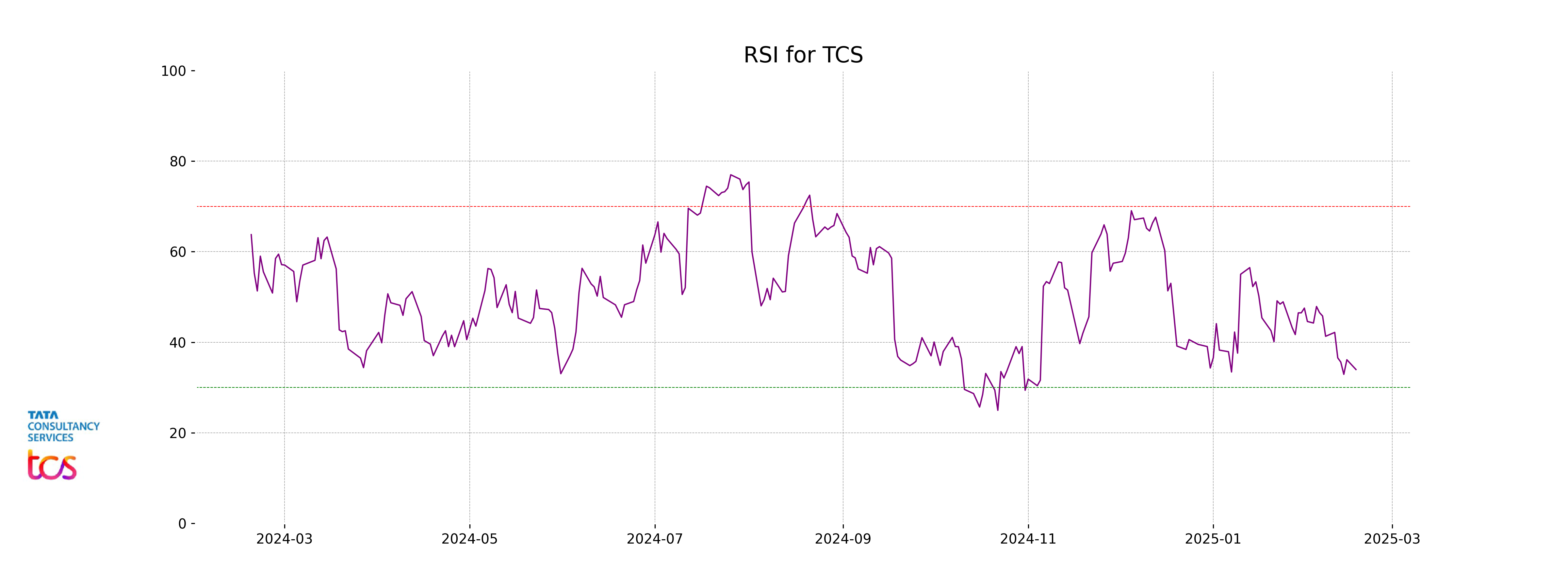 The Relative Strength Index (RSI) for TCS is 33.97, which suggests that the stock might be approaching oversold conditions. Typically, an RSI reading below 30 is considered oversold, indicating potential for a rebound, though TCS is not quite at that level yet. Traders may see this as a signal to watch for any potential price reversals.