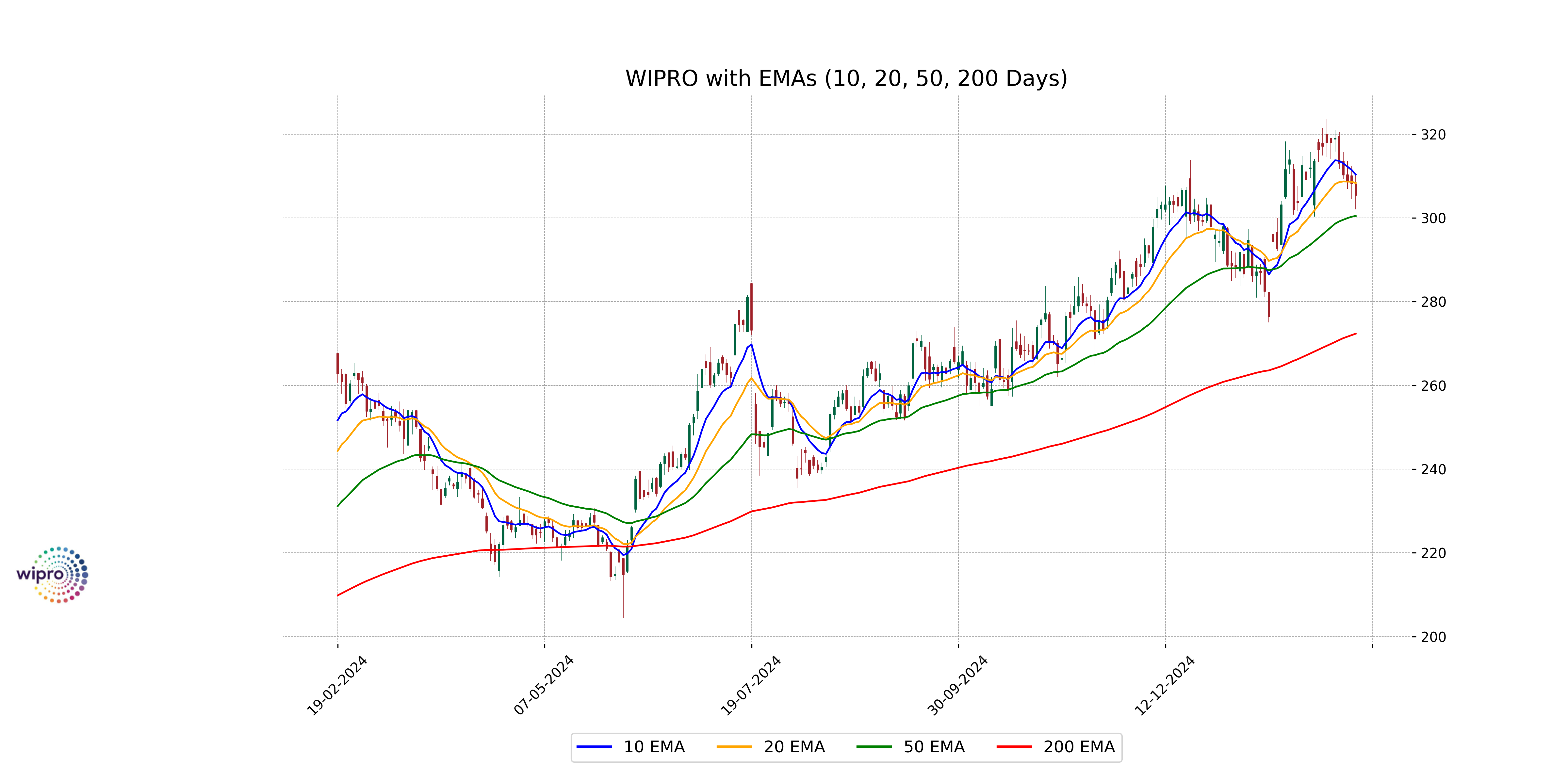 Based on the provided data, Wipro's latest closing price of 305.35 is above its 50-day EMA of 300.46 and significantly above its 200-day EMA of 272.34, indicating a longer-term upward trend. However, it is below the 10-day EMA of 310.33 and the 20-day EMA of 308.31, suggesting short-term bearish momentum.