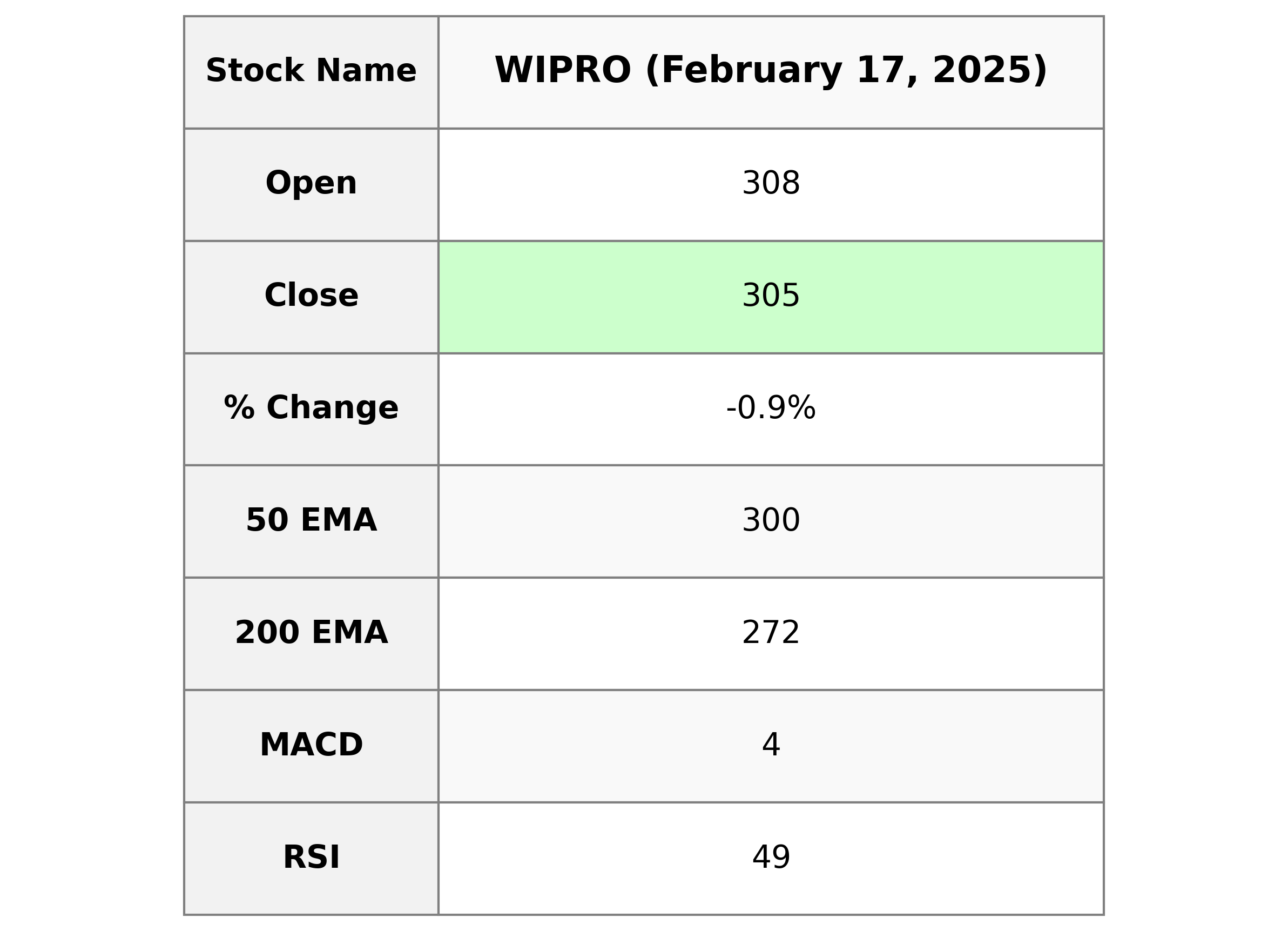 **Wipro** performance shows a slight decline with a closing stock price of 305.35, marking a decrease of 0.89% from the previous close. The stock's movements are supported by a robust volume of 7,506,534 shares. Wipro operates in the **Technology** sector, focusing on **Information Technology Services** in **India**.