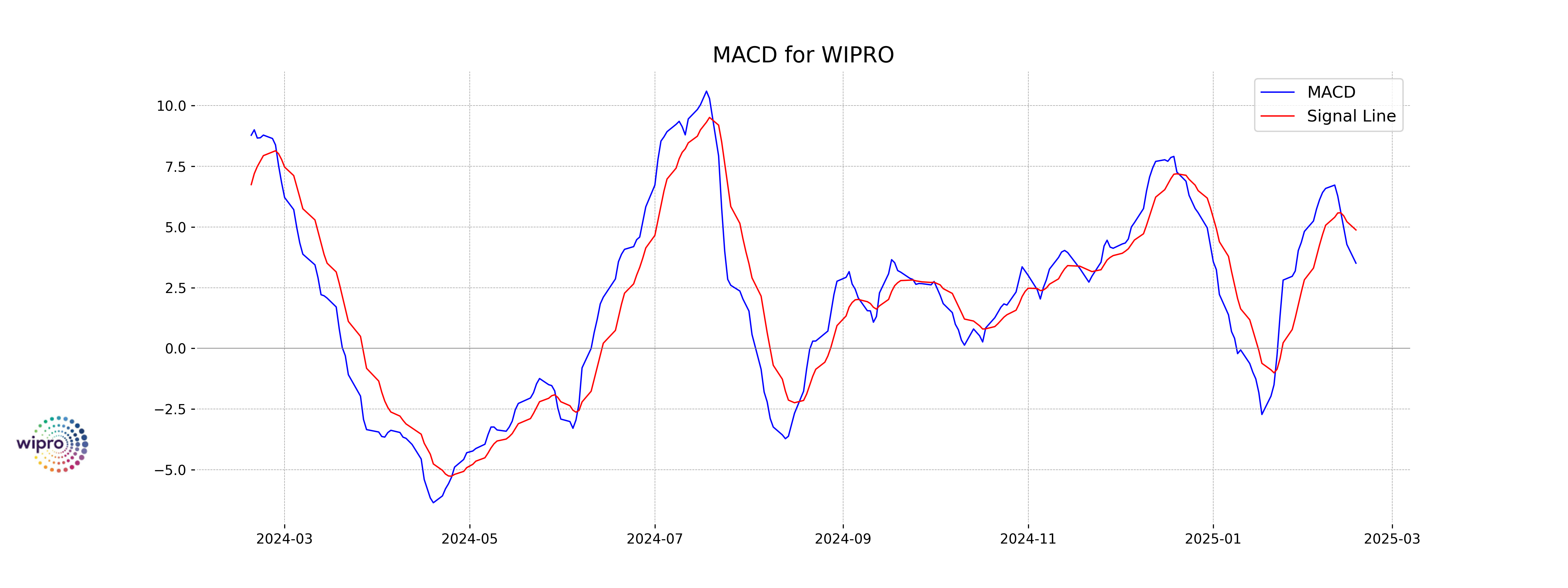 **Wipro**: The MACD line for Wipro is below the MACD Signal line suggesting a bearish trend. This could be indicative of a potential downward movement in the stock price if the trend continues. Careful monitoring of the MACD for any reversal signals or divergences is recommended.