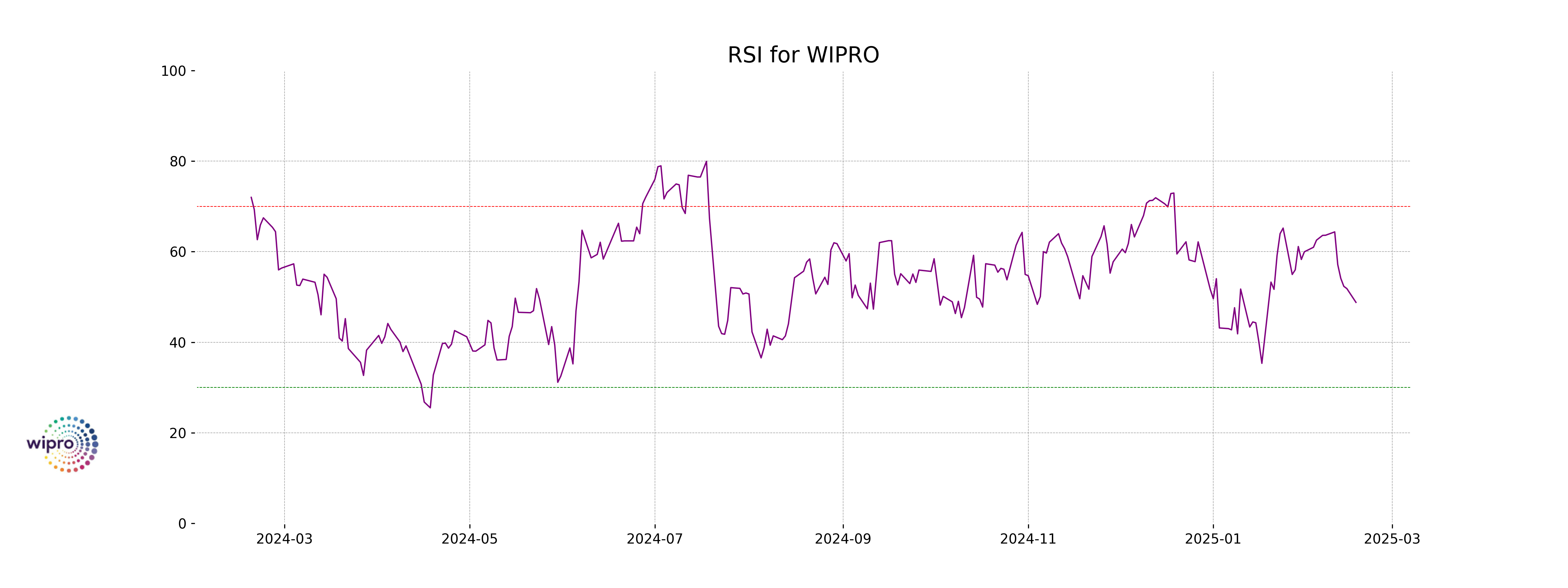 The RSI (Relative Strength Index) for Wipro is 48.80, which suggests that the stock is neither overbought nor oversold. It is close to the neutral 50 level, indicating a balance between buying and selling pressures.