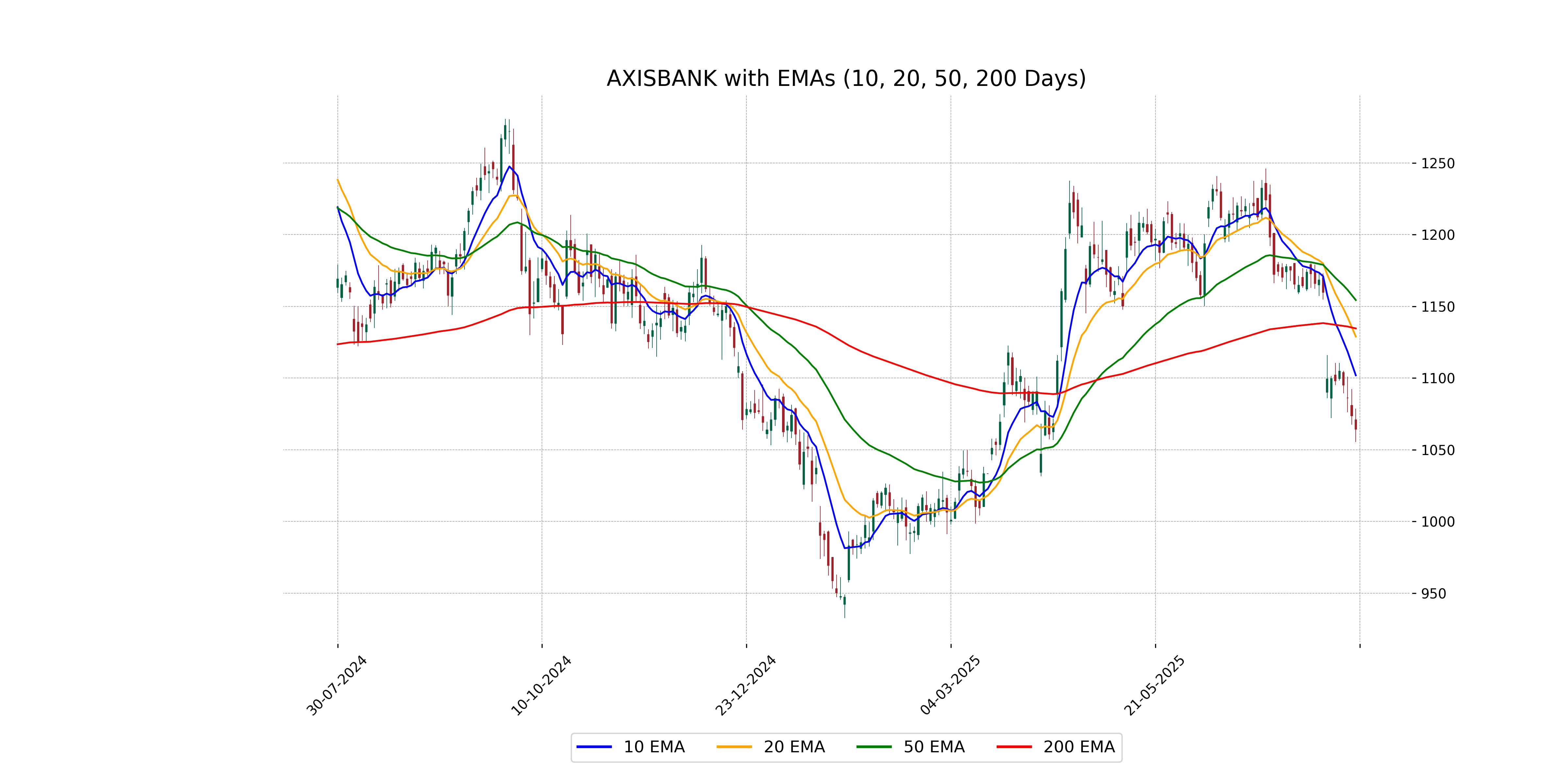 Axis Bank is currently trading below its key moving averages, with its closing price of 1064.20 falling below the 10-day EMA of 1101.84, 20-day EMA of 1128.90, 50-day EMA of 1154.30, and 200-day EMA of 1134.55. This indicates a potential bearish trend as the price is not only below the short-term averages but also below the longer-term averages.