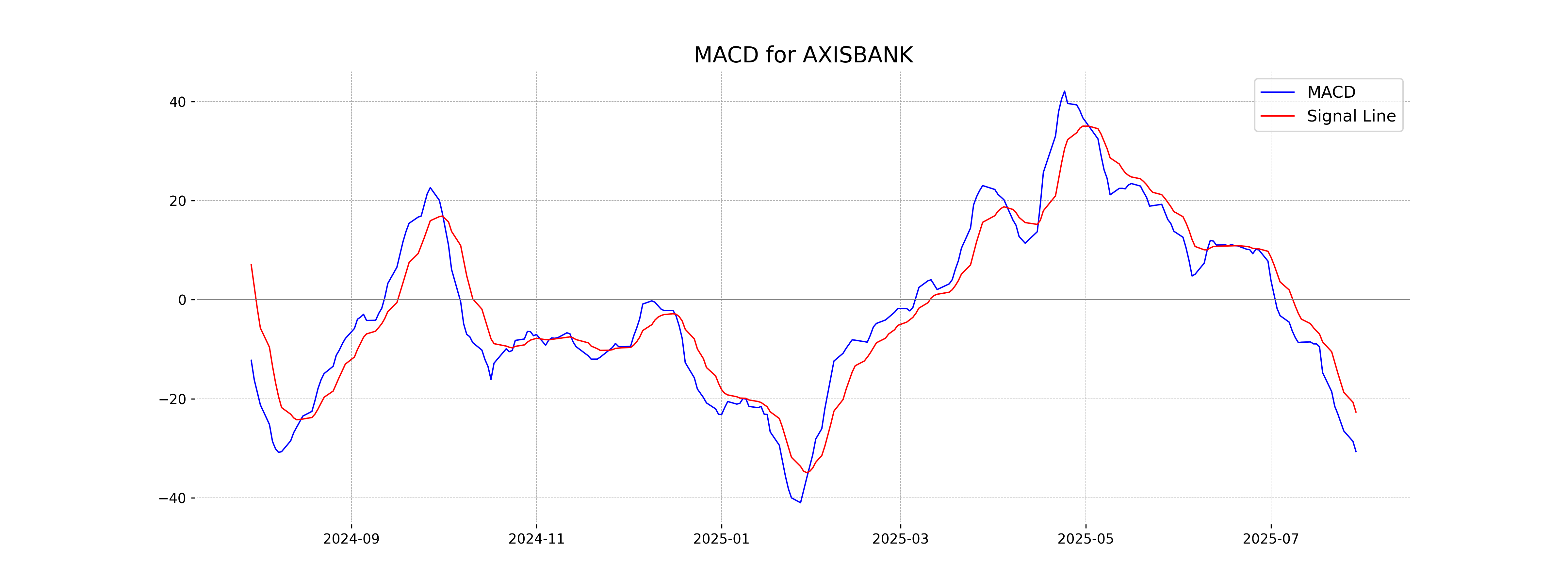 Axis Bank's MACD is currently at -30.65, which is below the MACD Signal line of -22.69. This negative MACD value suggests a bearish momentum, indicating that the stock might continue to face selling pressure in the short term.