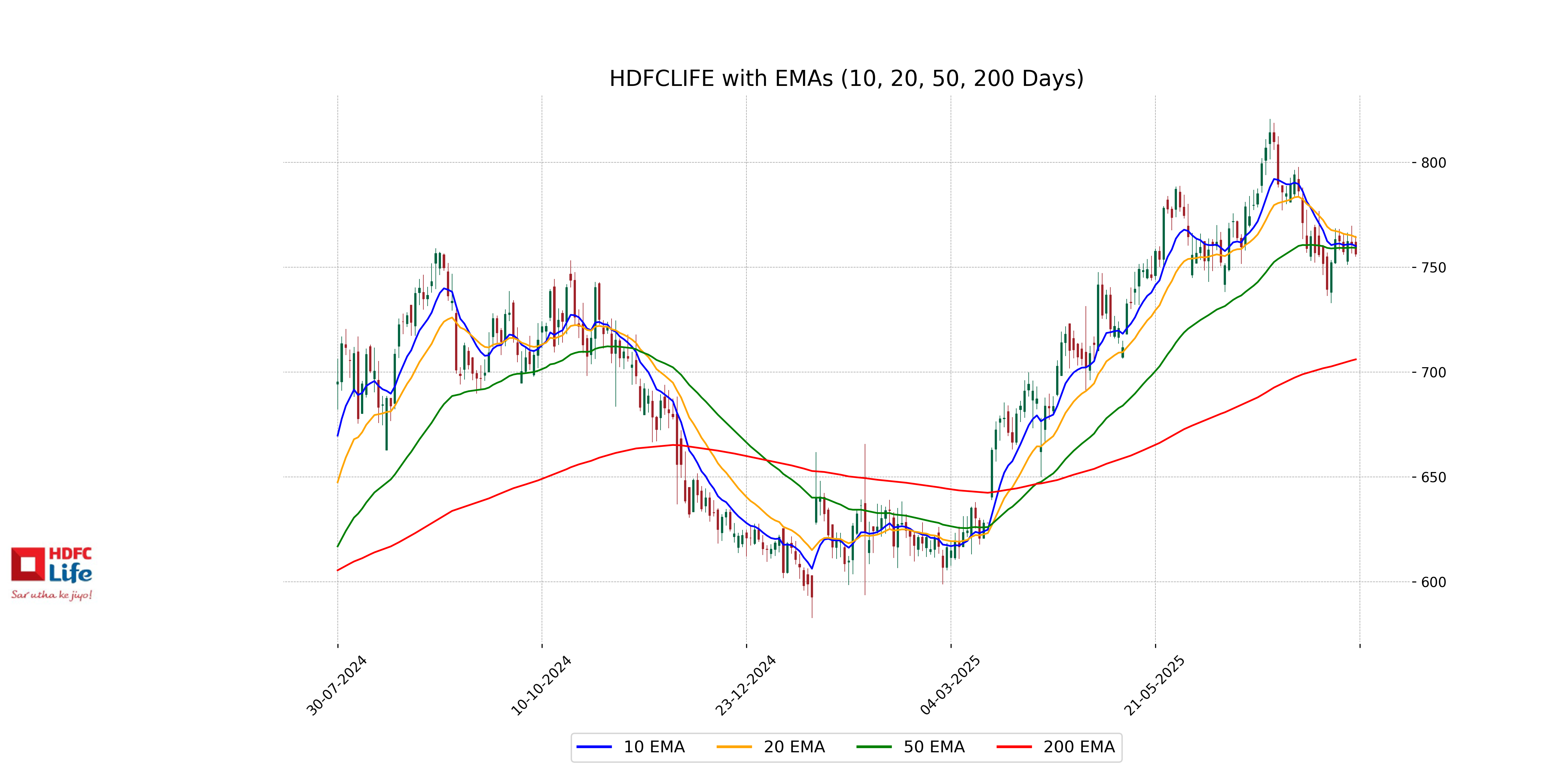 For HDFC Life, the closing price of 756.35 is below its 10-day EMA of 760.14, indicating a short-term bearish trend. It is also below the 50-day EMA of 759.29 but above the 200-day EMA of 706.07, suggesting medium-term weakness but long-term strength.