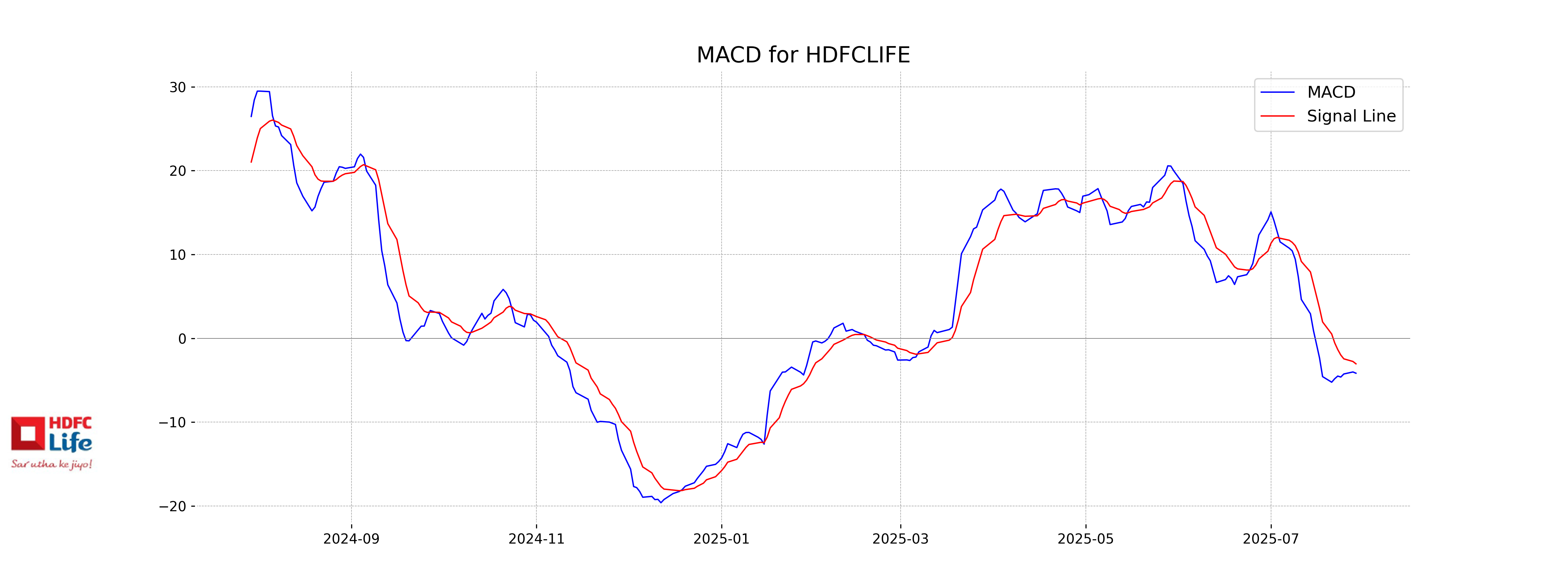 MACD Analysis for HDFC Life: The MACD value for HDFC Life is -4.17, which is below the MACD Signal of -3.05. This suggests that the stock is currently in a bearish phase, as the MACD line is below the signal line, indicating potential downward momentum.