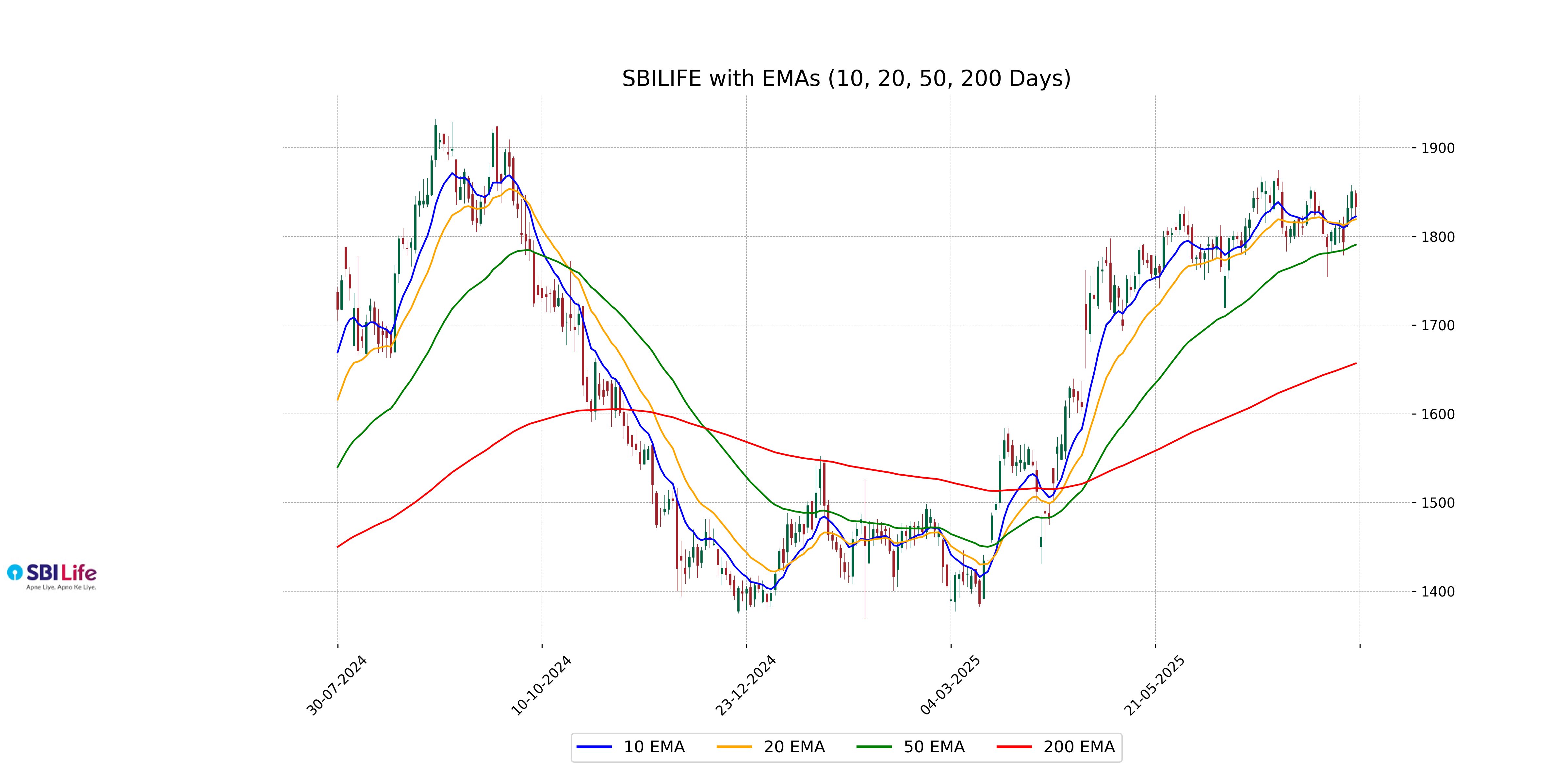 SBI Life's latest closing price of 1833.40 is slightly above its 10 EMA of 1822.56 and 20 EMA of 1819.33, indicating a short-term bullish position. However, it is slightly below its previous close of 1850.5 and is above its 50 EMA of 1790.58 and significantly above its 200 EMA of 1656.97, reflecting a longer-term upward trend.