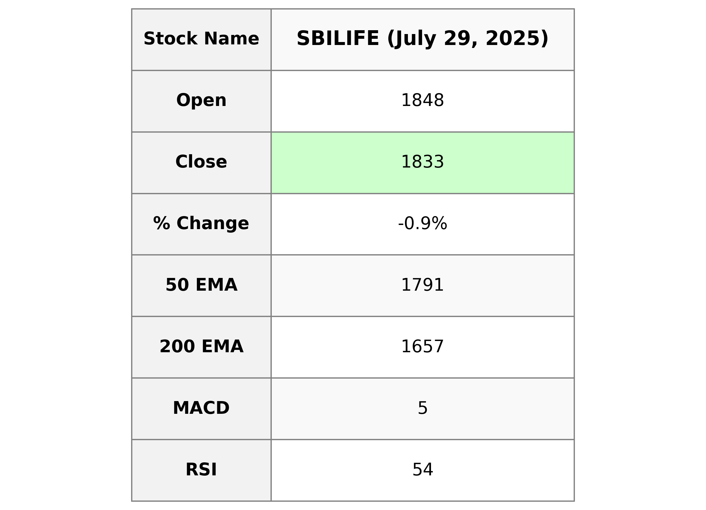 SBI Life Performance: The stock opened at 1848.0 and closed at 1833.4, marking a percentage change of -0.92% from its previous close of 1850.5. The company's financial indicators show a stable outlook, with a Market Cap of 1,837,708,607,488 and an EPS of 24.8, indicating a strong position in the Financial Services sector, specifically in the Insurance - Life industry in India.
