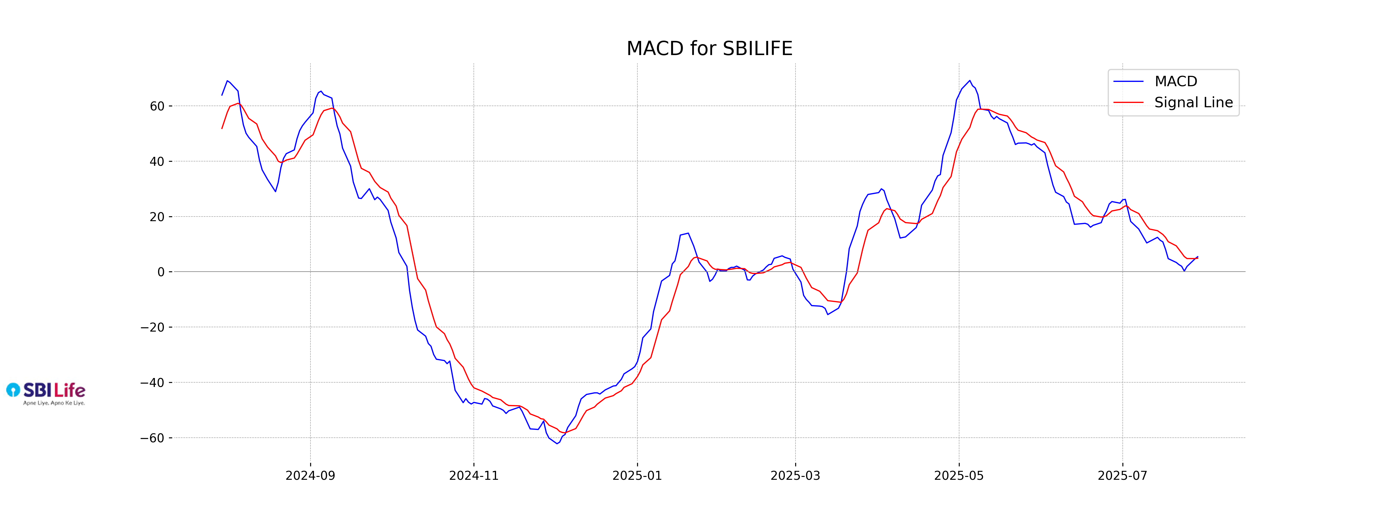 SBI Life's MACD value is 5.43, which is higher than its MACD Signal of 4.89. This indicates a bullish signal, suggesting potential upward momentum in the stock's price. The current RSI is 54.35, placing it in the neutral zone, which implies that the stock is not overbought or oversold.