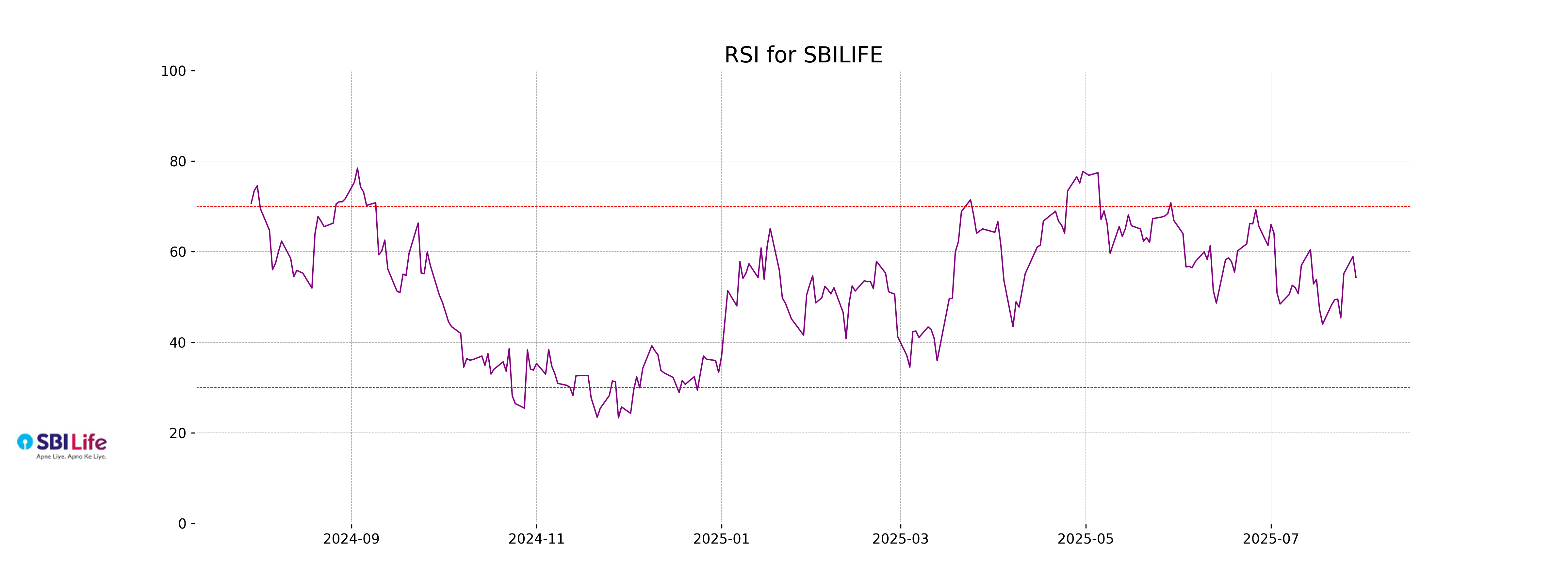 RSI Analysis for SBI Life: The RSI (Relative Strength Index) for SBI Life is 54.35, indicating that the stock is in a neutral zone. It neither shows overbought tendencies nor does it suggest that the stock is oversold. Investors might consider this level as a balanced point, without immediate upward or downward pressure.