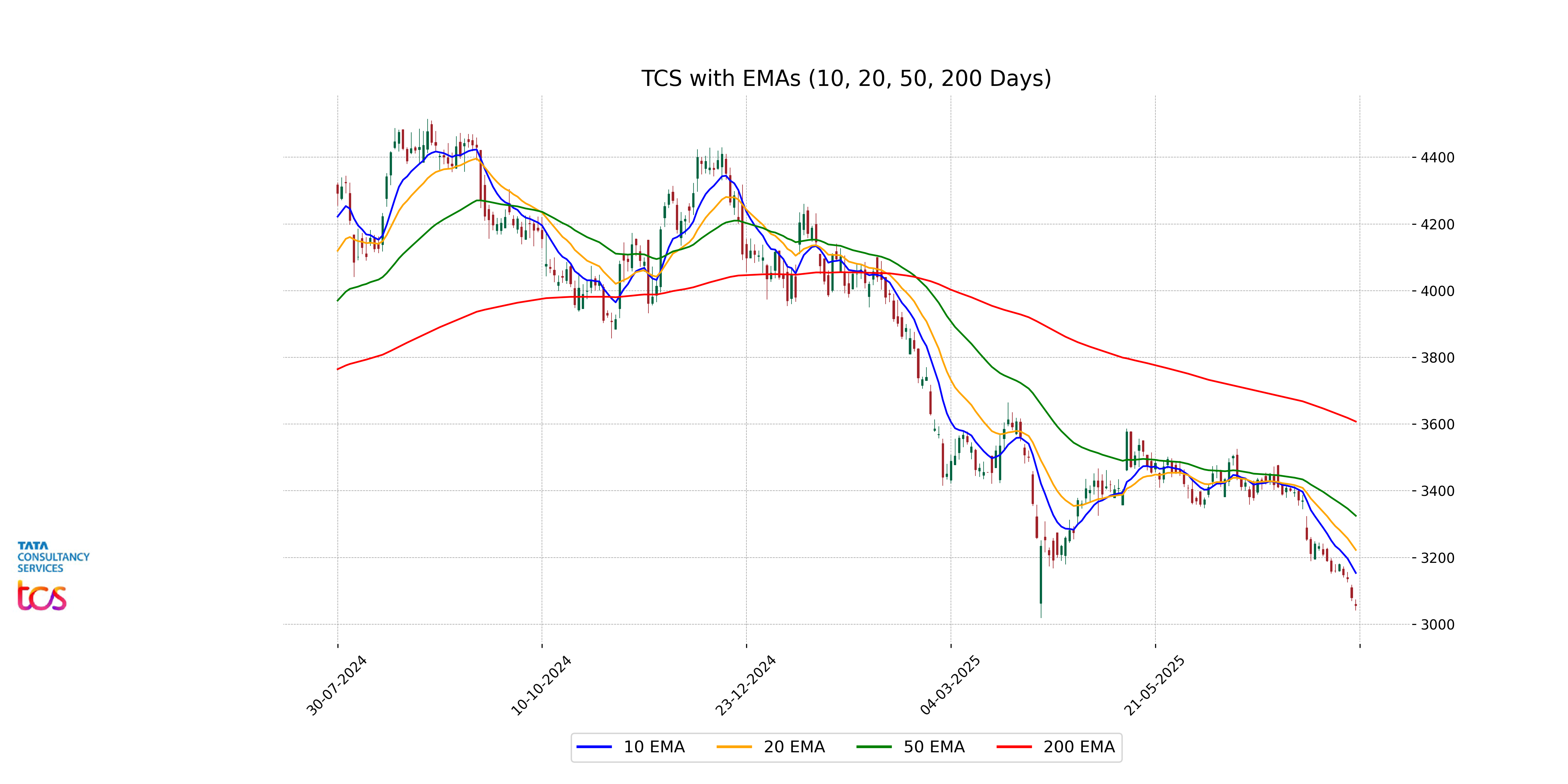 Based on the provided data, TCS is currently trading below its key moving averages, with the current price of 3056.0 below the 10 EMA (3153.72), 20 EMA (3222.80), 50 EMA (3325.16), and 200 EMA (3607.67), indicating potential bearish sentiment. The RSI value of 20.53 suggests that the stock may be in oversold territory.