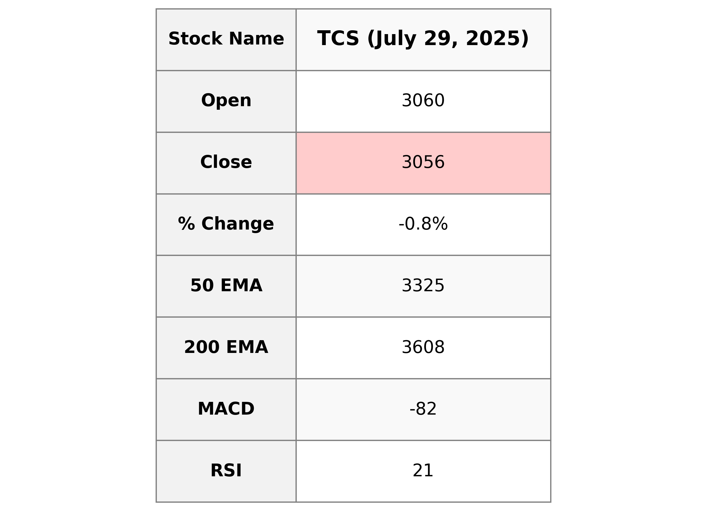 ### TCS Performance Overview TCS has witnessed a minor decrease in its stock price, closing at 3056.0, reflecting a percentage change of -0.76% from its previous close. The stock's current RSI is relatively low at 20.53, suggesting potential oversold conditions. Despite the market cap standing strong at over 12 trillion, it is trading below its 50 and 200 EMA, showing a downtrend. The P/E ratio of 22.45 indicates the stock's valuation relative to its earnings. ### Sector & Industry TCS operates within the Technology sector, specifically in Information Technology Services, and is headquartered in India.
