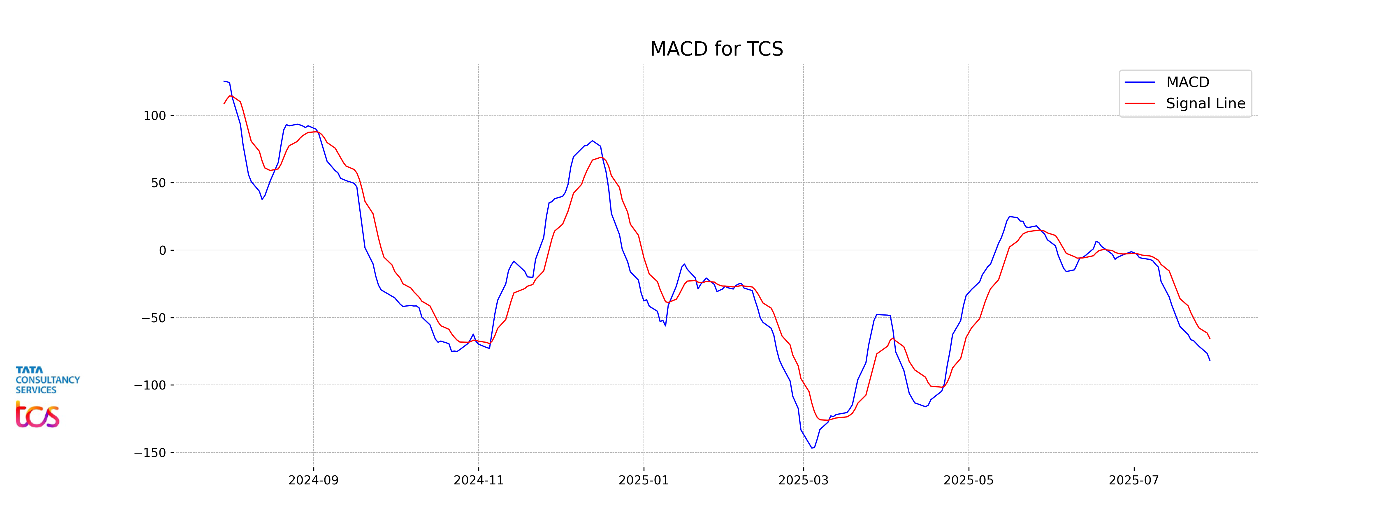 Based on the data, the MACD for TCS is at -81.67, which is below the MACD signal line of -65.55. This indicates bearish momentum, suggesting that the stock may continue to face downward pressure in the short term.