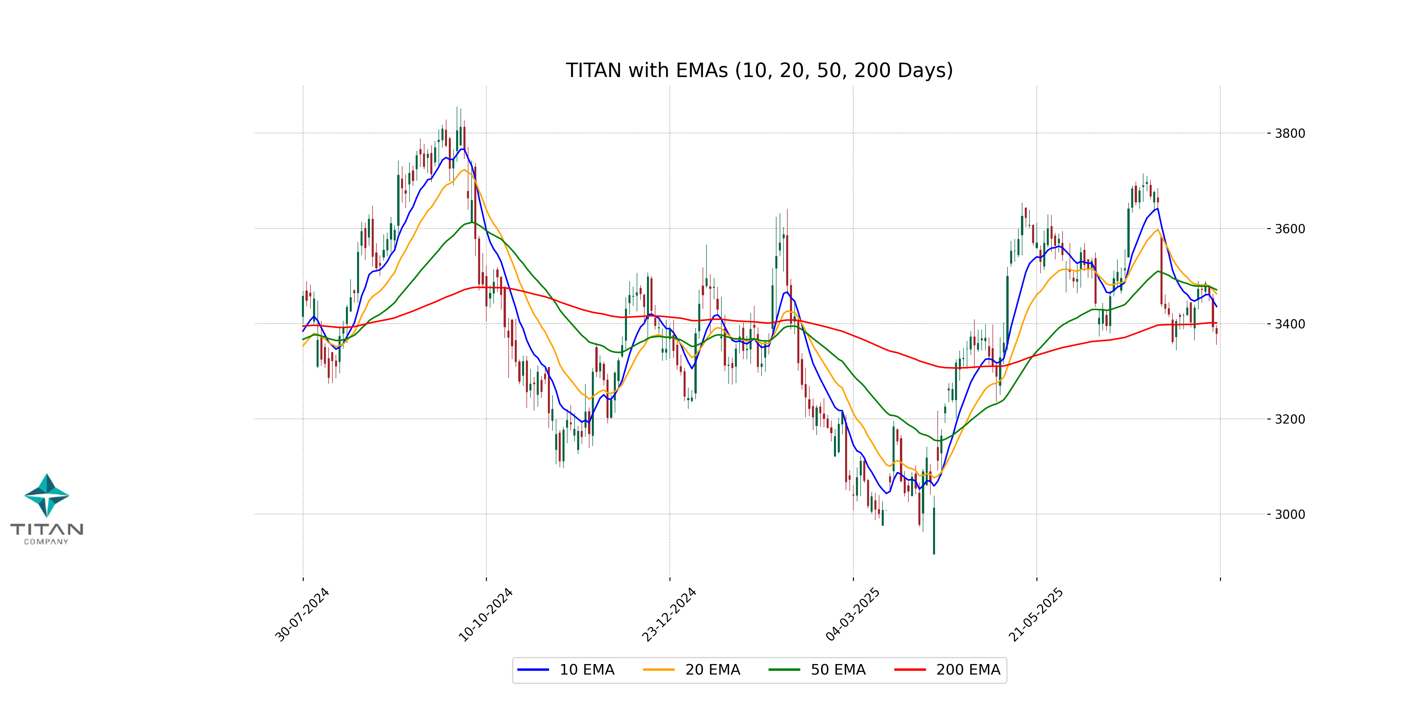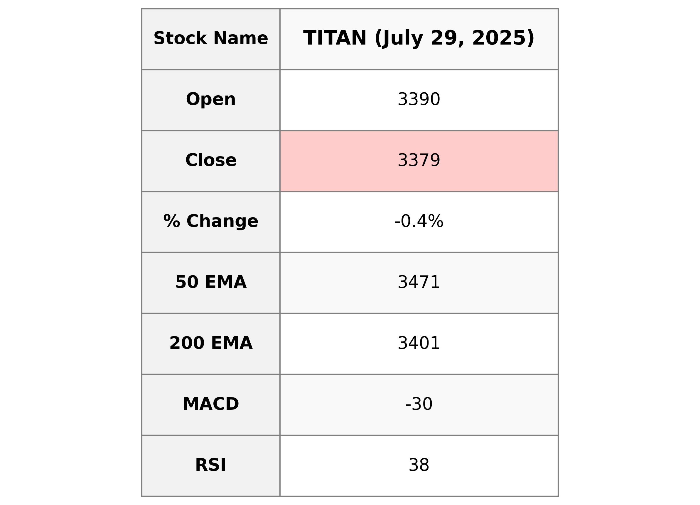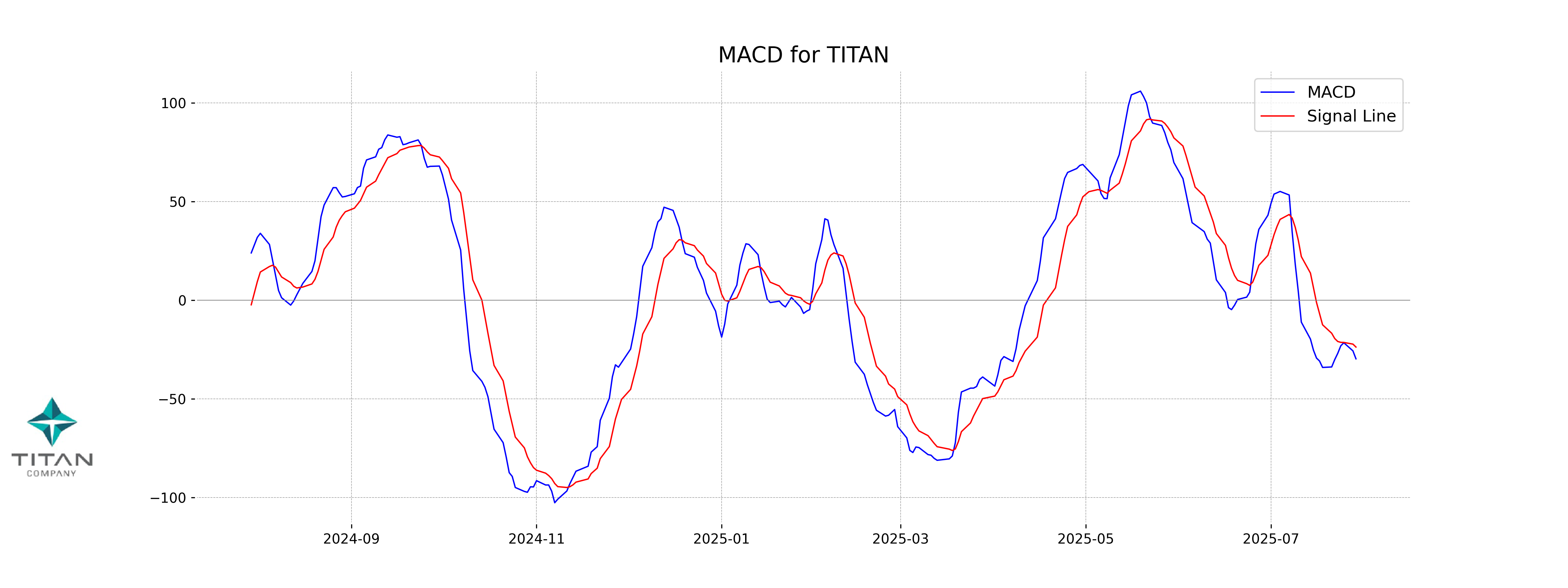 MACD Analysis for Titan Company: The MACD value of -29.67, which is below the MACD Signal line of -23.71, indicates a bearish trend. This suggests that the stock may experience further downward momentum unless there is a reversal in price action.